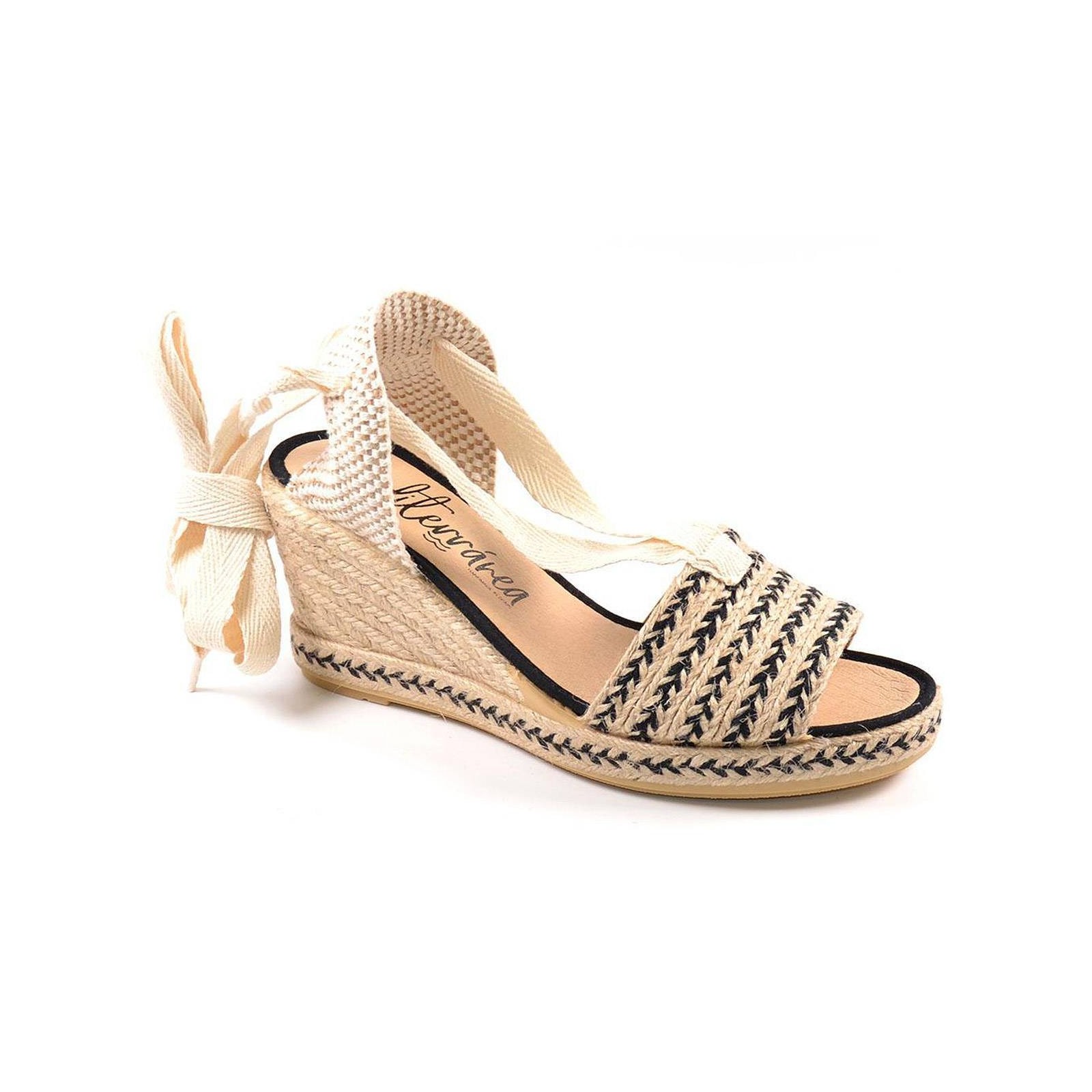 10333 Mediterránea. Zapatilla Alpargata Valenciana con pala de rafia y textil. Cierre con cintas para atar por la pierna.Plantilla acolchada de máximo confort.Piso con cuña de yute y suela de goma antideslizante. Un estilo especial para verano.