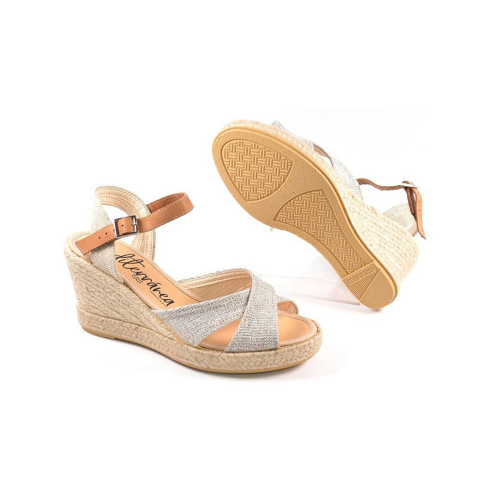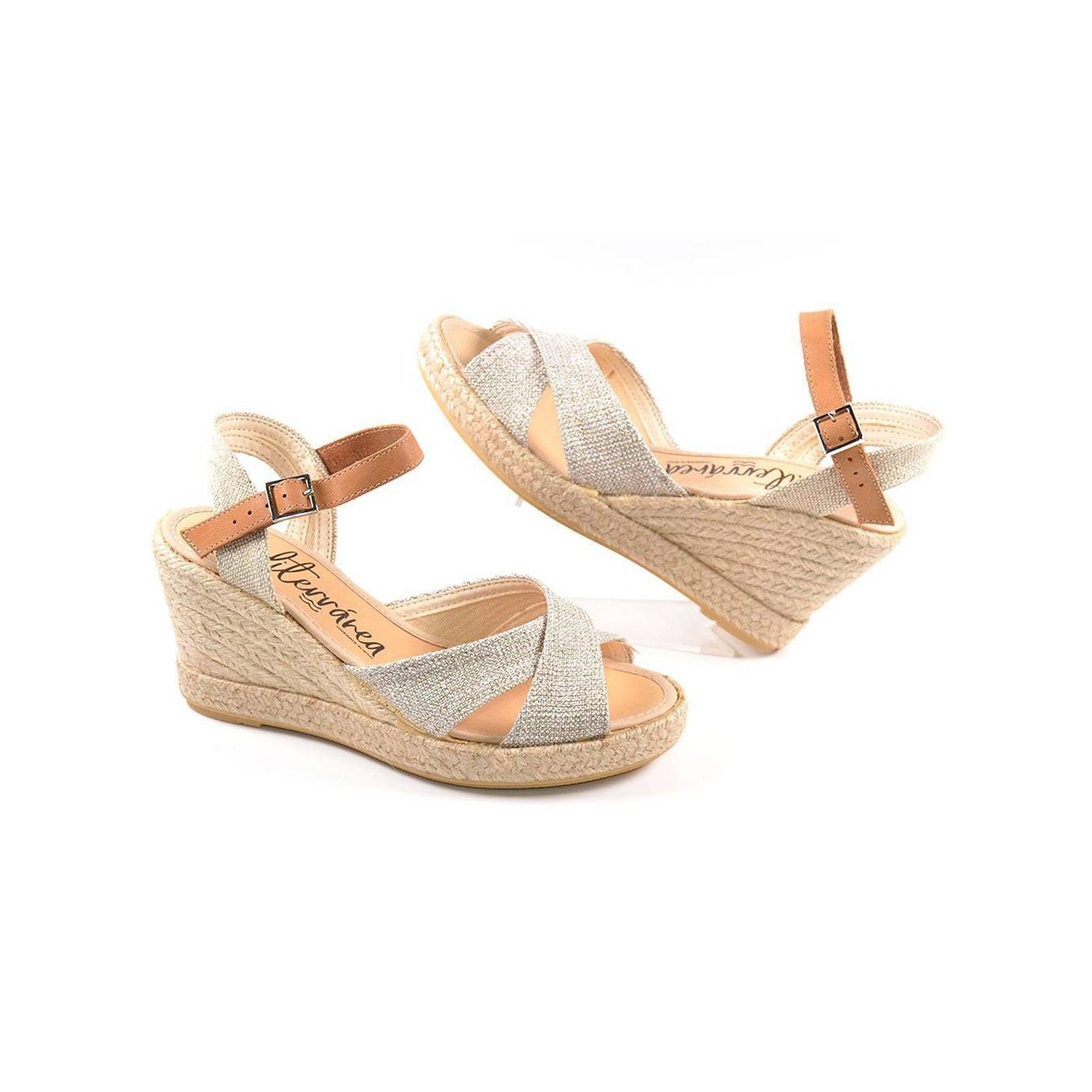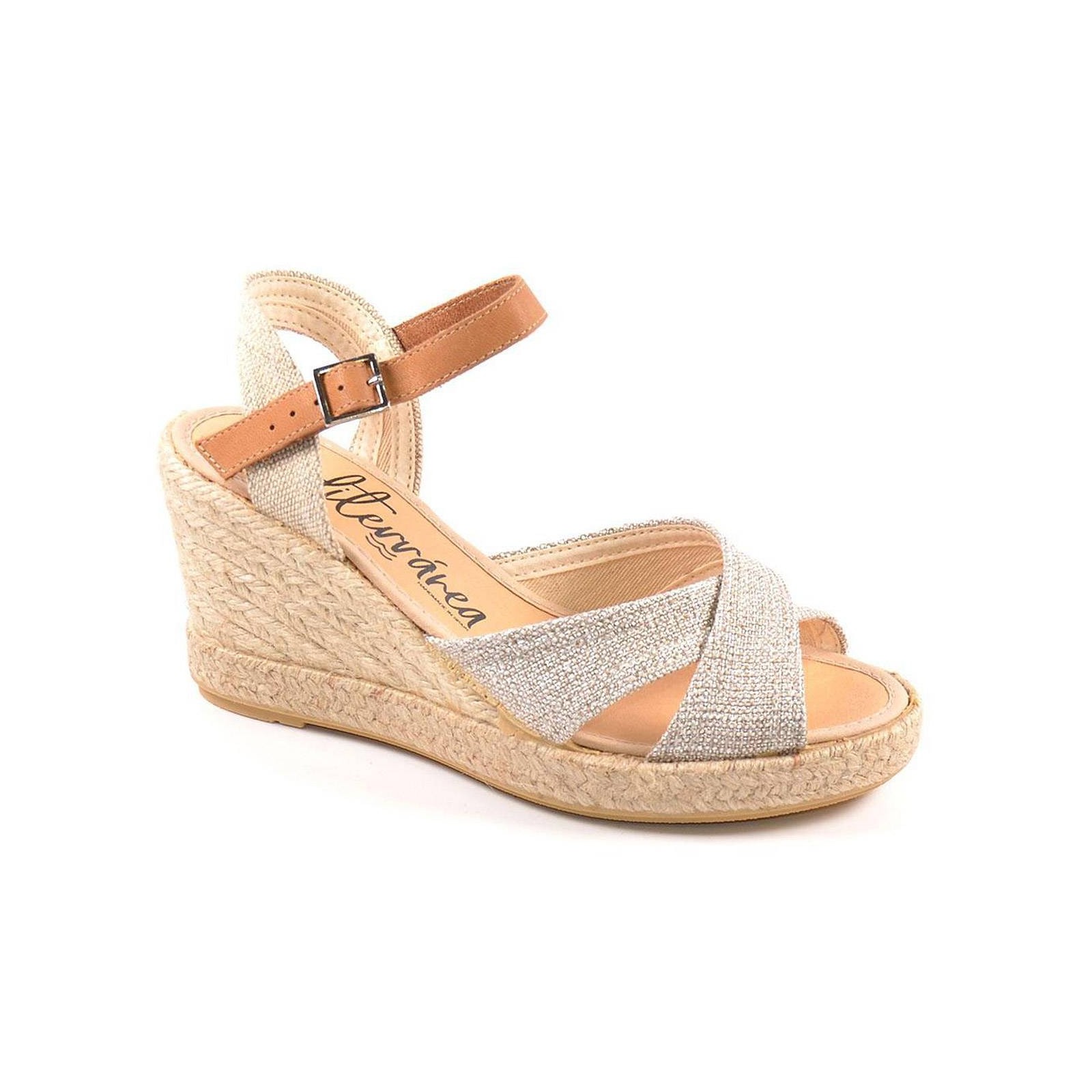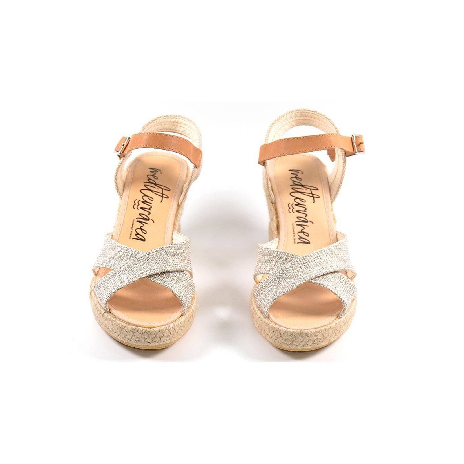 272 Mediterránea. Zapatilla Alpargata textil, pala de dos tiras cruzadas. Plantilla acolchada, muy confortable. Cierre pulsera con hebilla ajustable. Piso con cuña en yute y suela de goma antideslizante. Imprescindible para combinar con tus vestidos este verano.