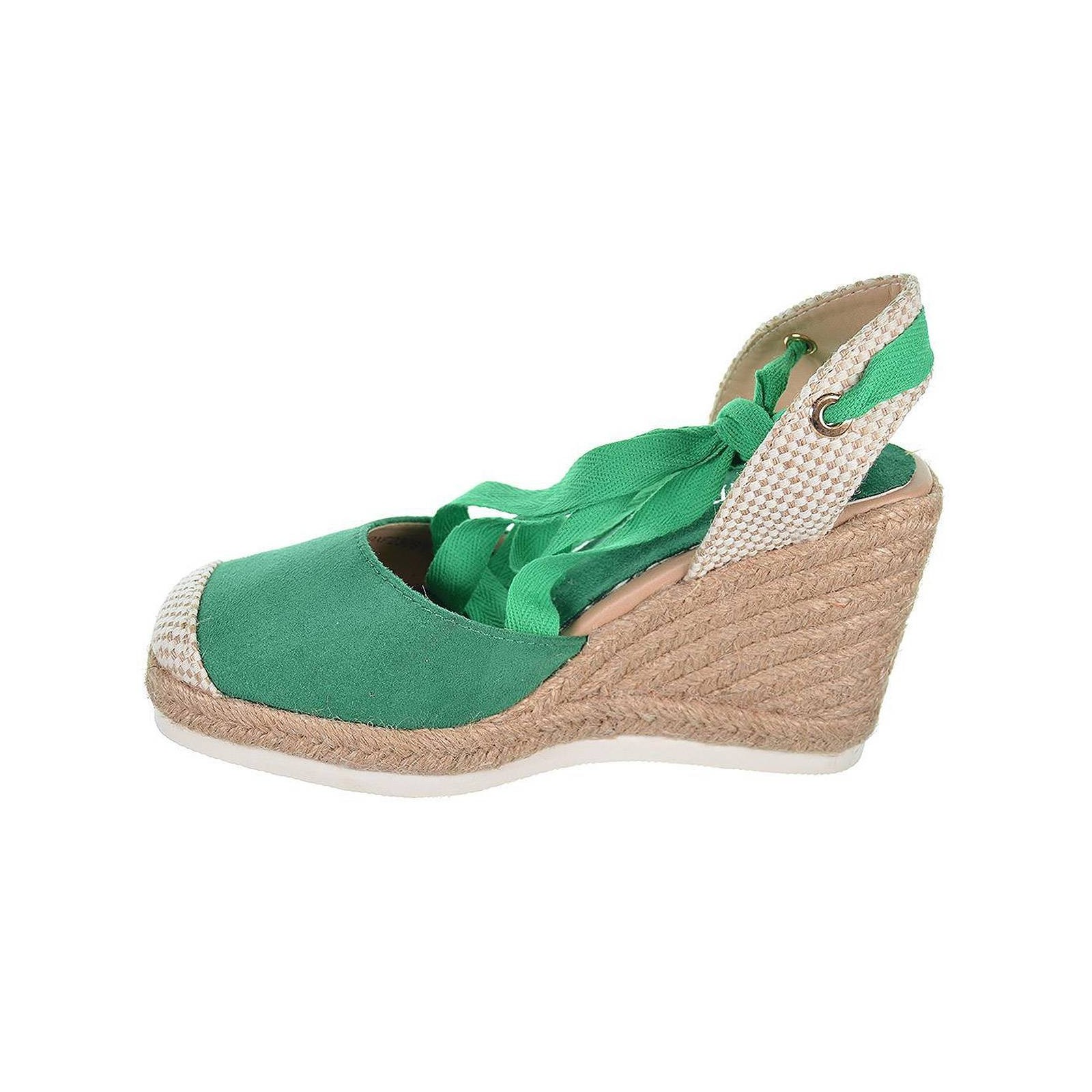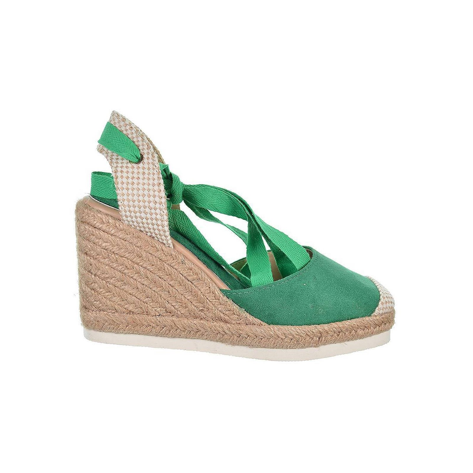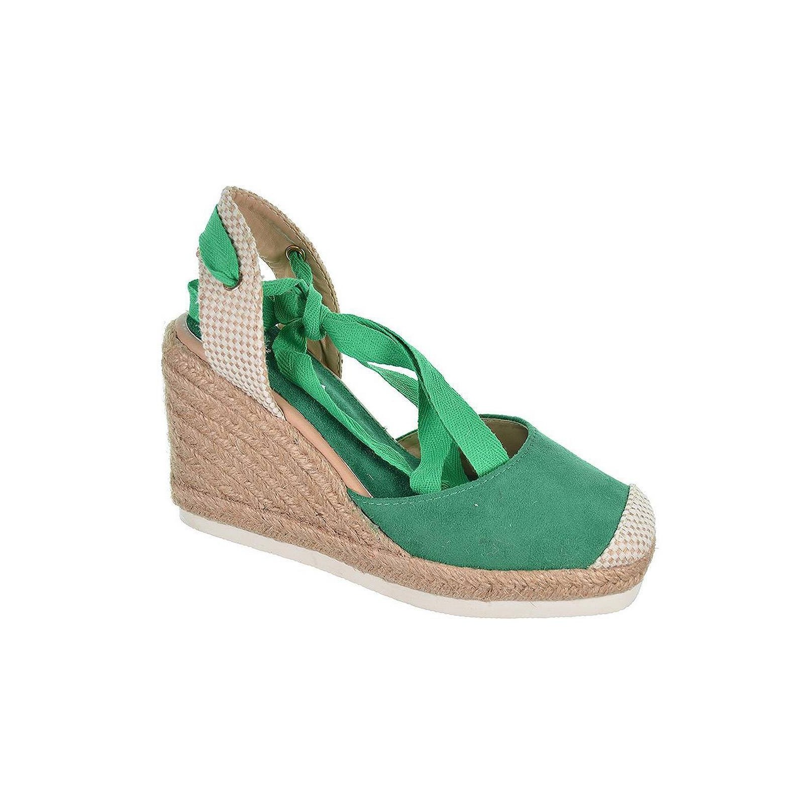 23091 D´Angela. Alpargata antelina con puntera en textil y cintas para atar en pierna. Plantilla textil acolchada muy confortable. Piso en yute con cuña de 9cm. de altura. Un diseño que no puede faltar en tu outfit este verano.