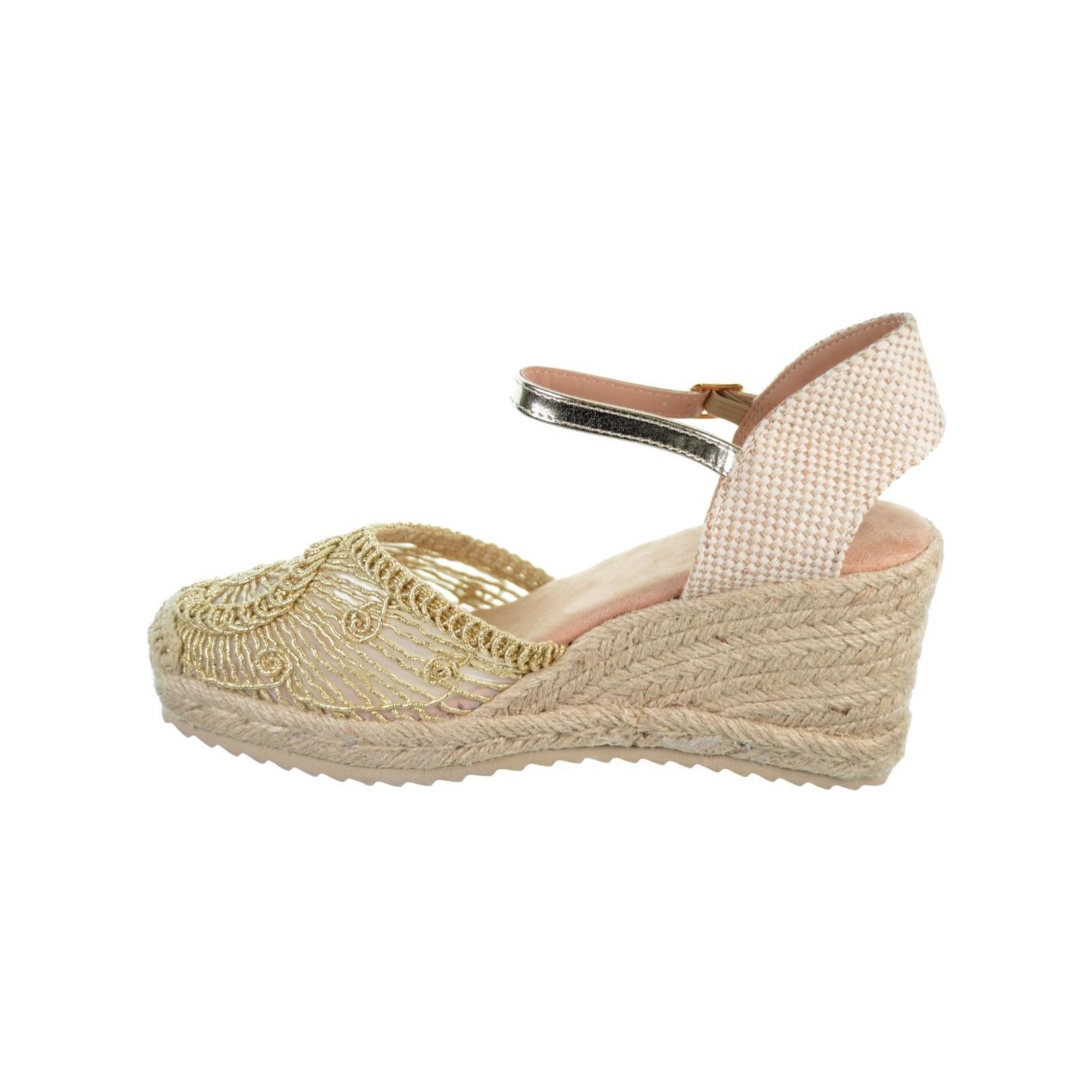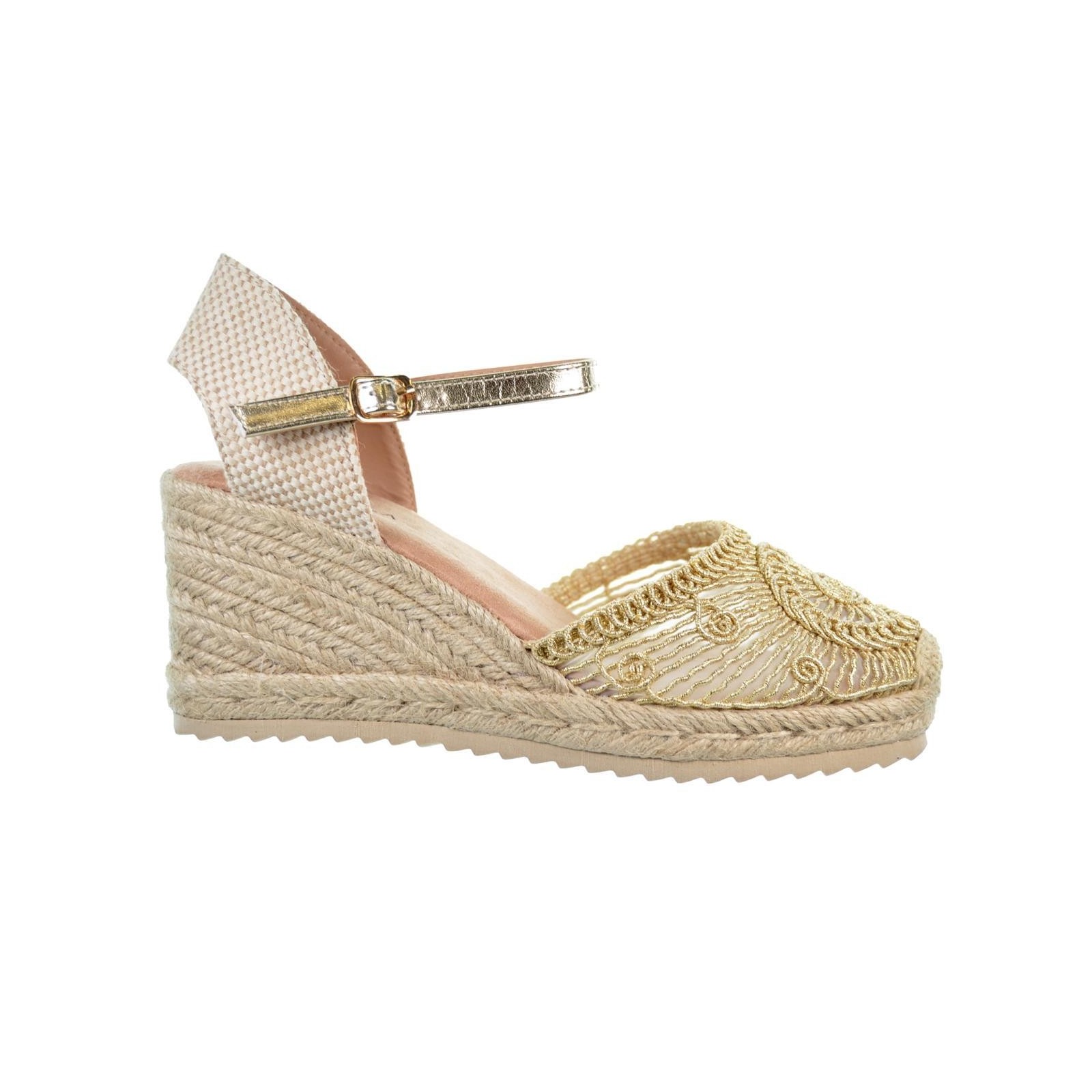 D´angela 28253 Alpargata textil metalizado, con rejilla interior transparente y cierre en pulsera con hebilla regulable. Plantilla textil acolchada muy confortable. Piso en yute con cuña de 8cm. de altura y plataforma de 2cm de altura en Eva termoconformada. Un diseño que no puede faltar en tu outfit este verano.