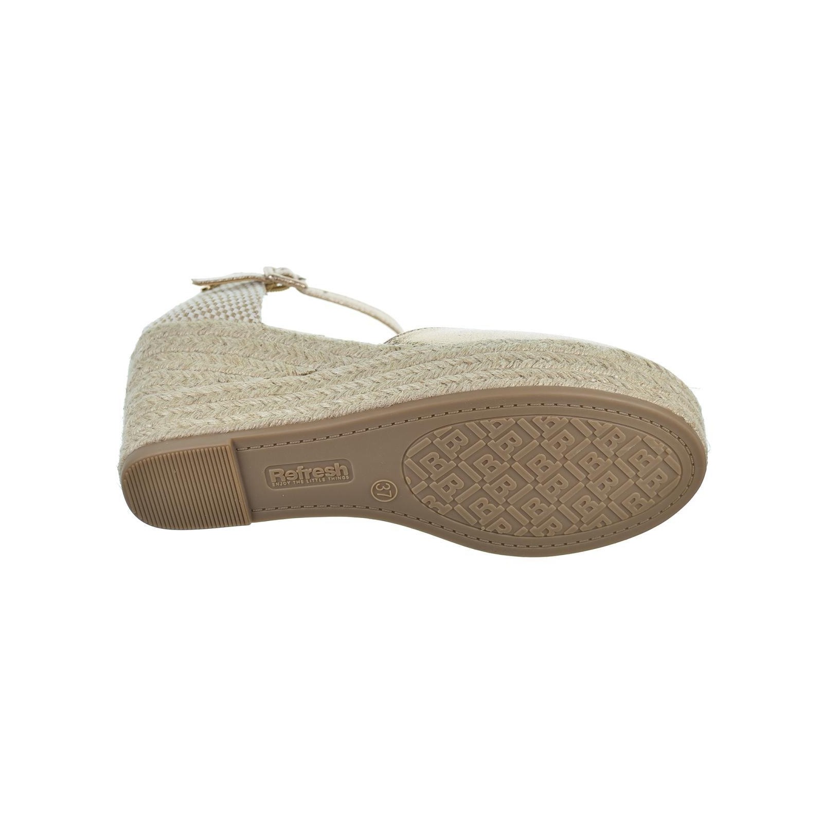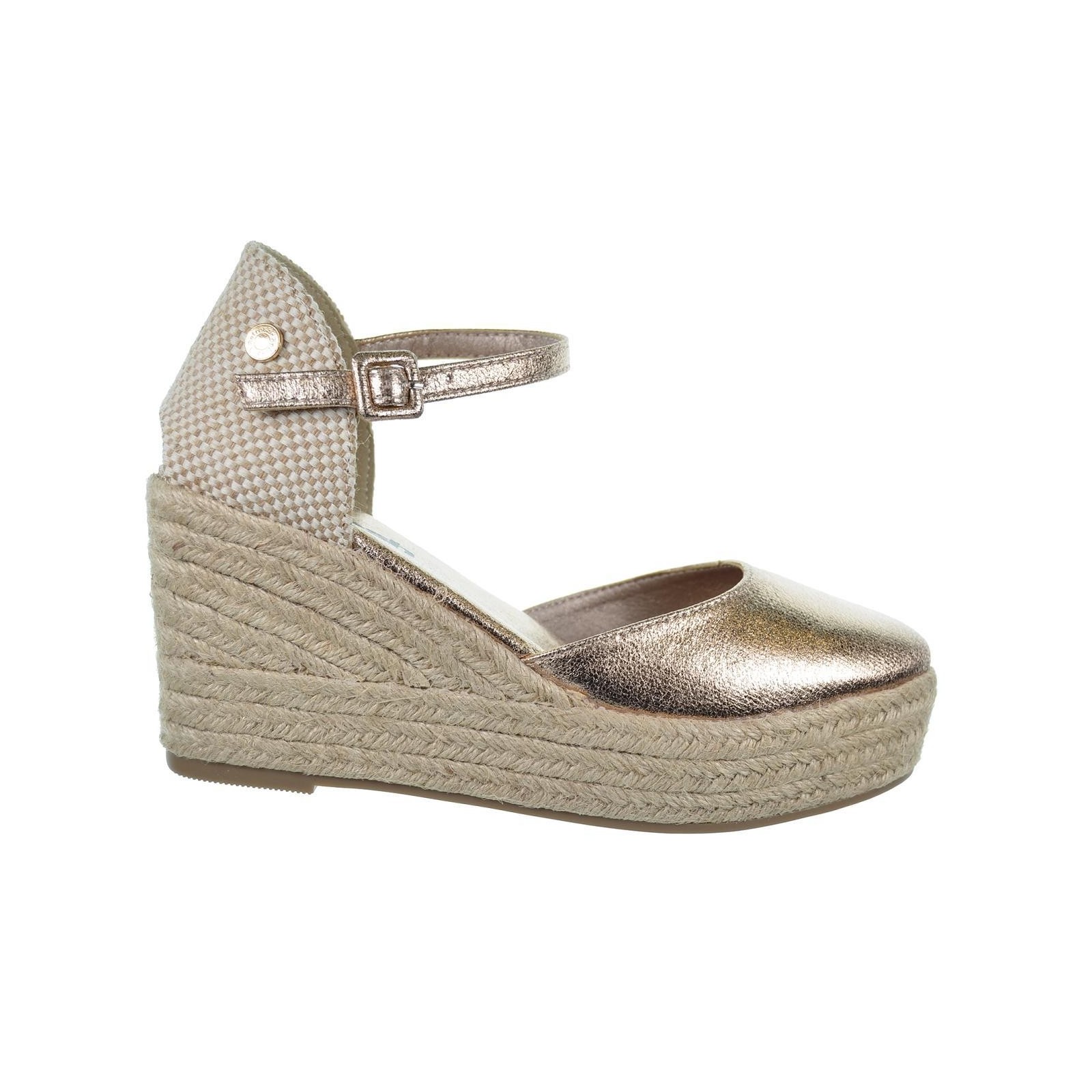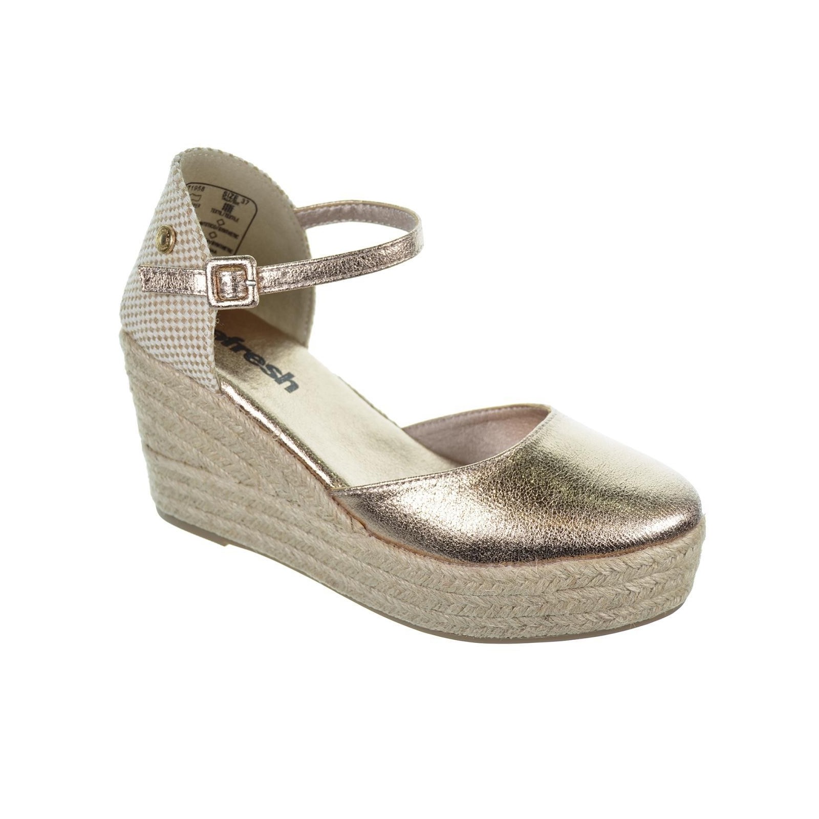 Refresh 171958 Alpargata tipo valenciana. Fabricada en sintético metalizado. Pulsera al tobillo con hebilla regulable. Cuña en yute de 8 cm de altura y suela de goma antideslizante. Este modelo ha obtenido el certificado vegano por la organización mundial PETA (Organización de los derechos de los animales).