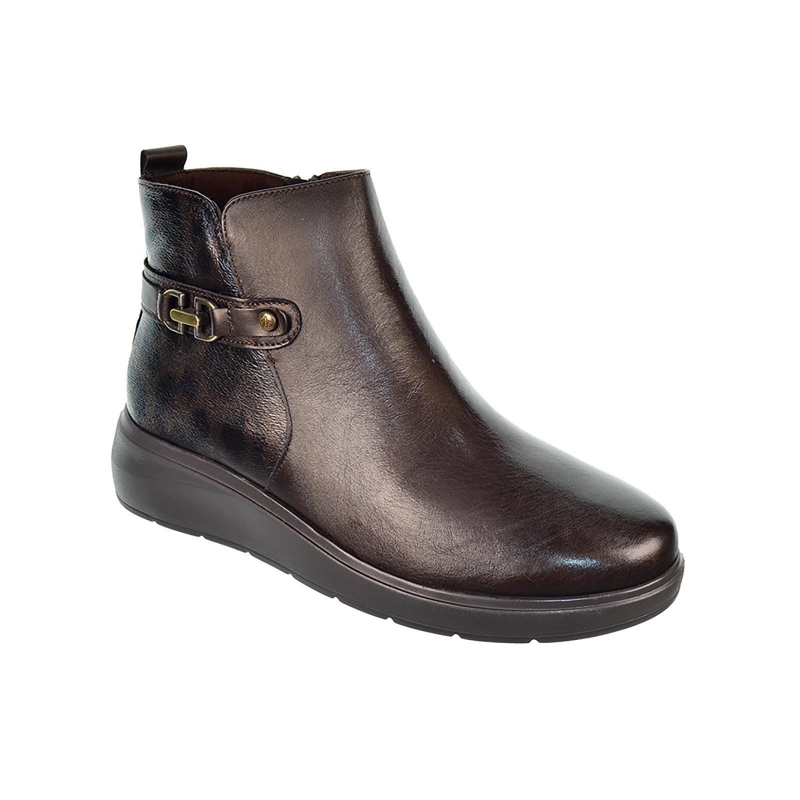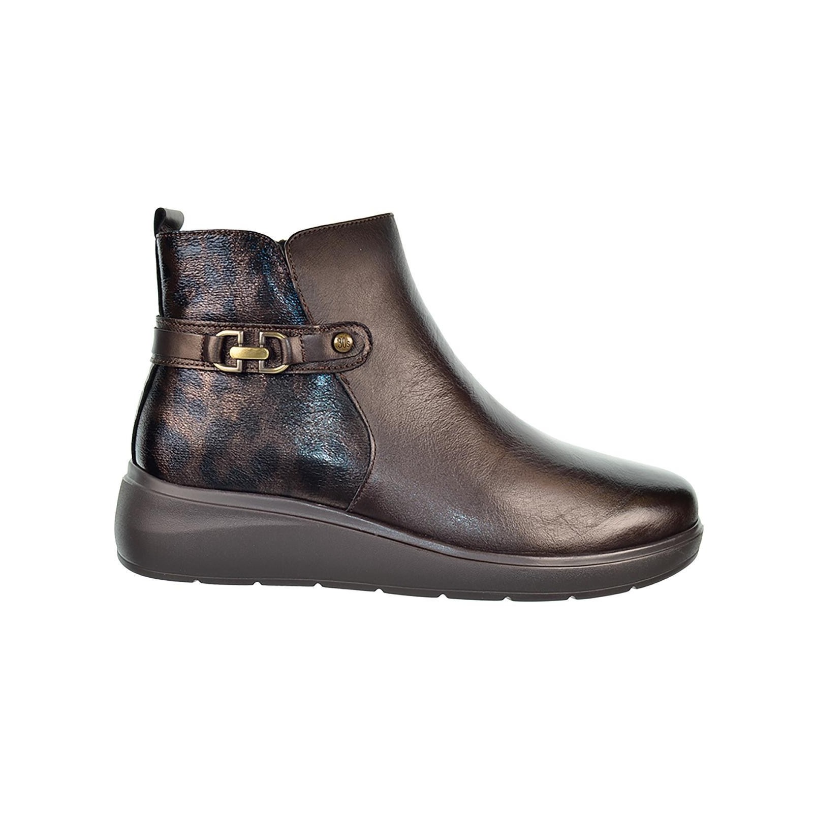 30s Treintas 4407 Botín en material de piel combinada con material en leopardo, forro interior y plantilla extraíble extra confort en textil. Cierre con cremallera interior y suela de poliuretano con cuña, muy flexible y ligero. Ideales para pies delicados.
