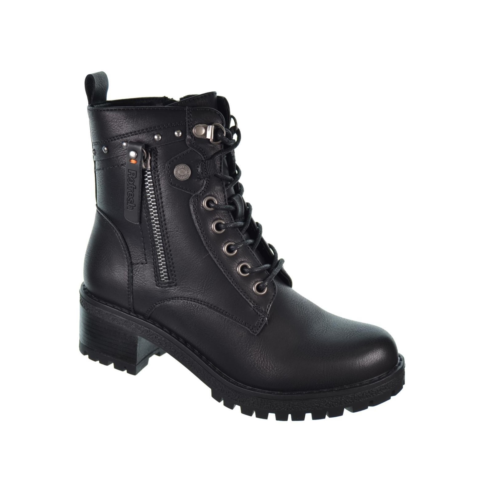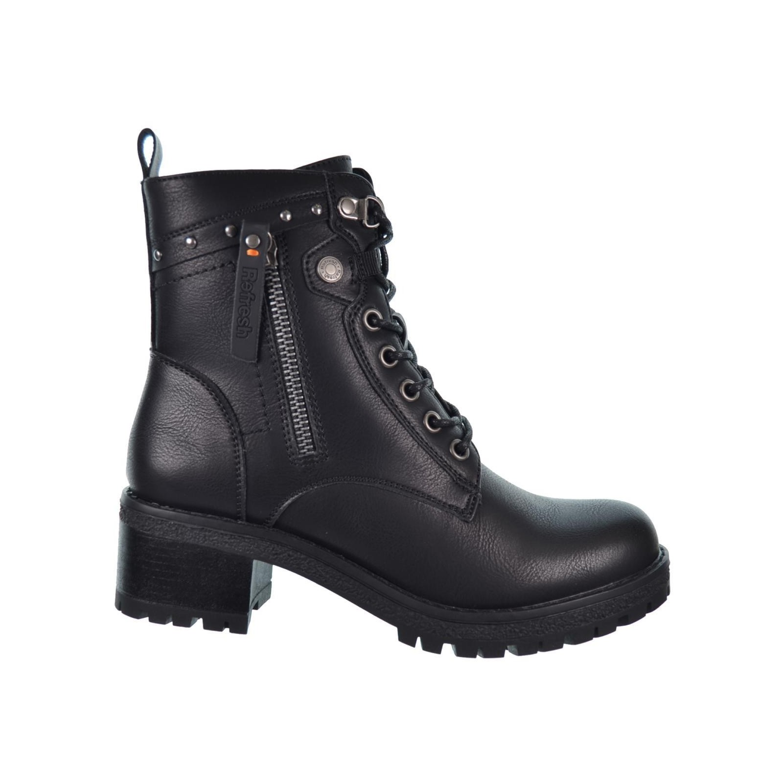 Refresh 172241 Botín en material que imita la piel. Forro interior textil y plantilla en sintético acolchada. Cierre con cremallera interior y cordones ajustables para mayor sujeción. Tirador trasero para facilitar la puesta. Suela de goma antideslizante con tacón de 5cm de altura. Un diseño ideal para el día a día. Este modelo ha obtenido el certificado vegano por la organización mundial PETA (Organización de los derechos de los animales).