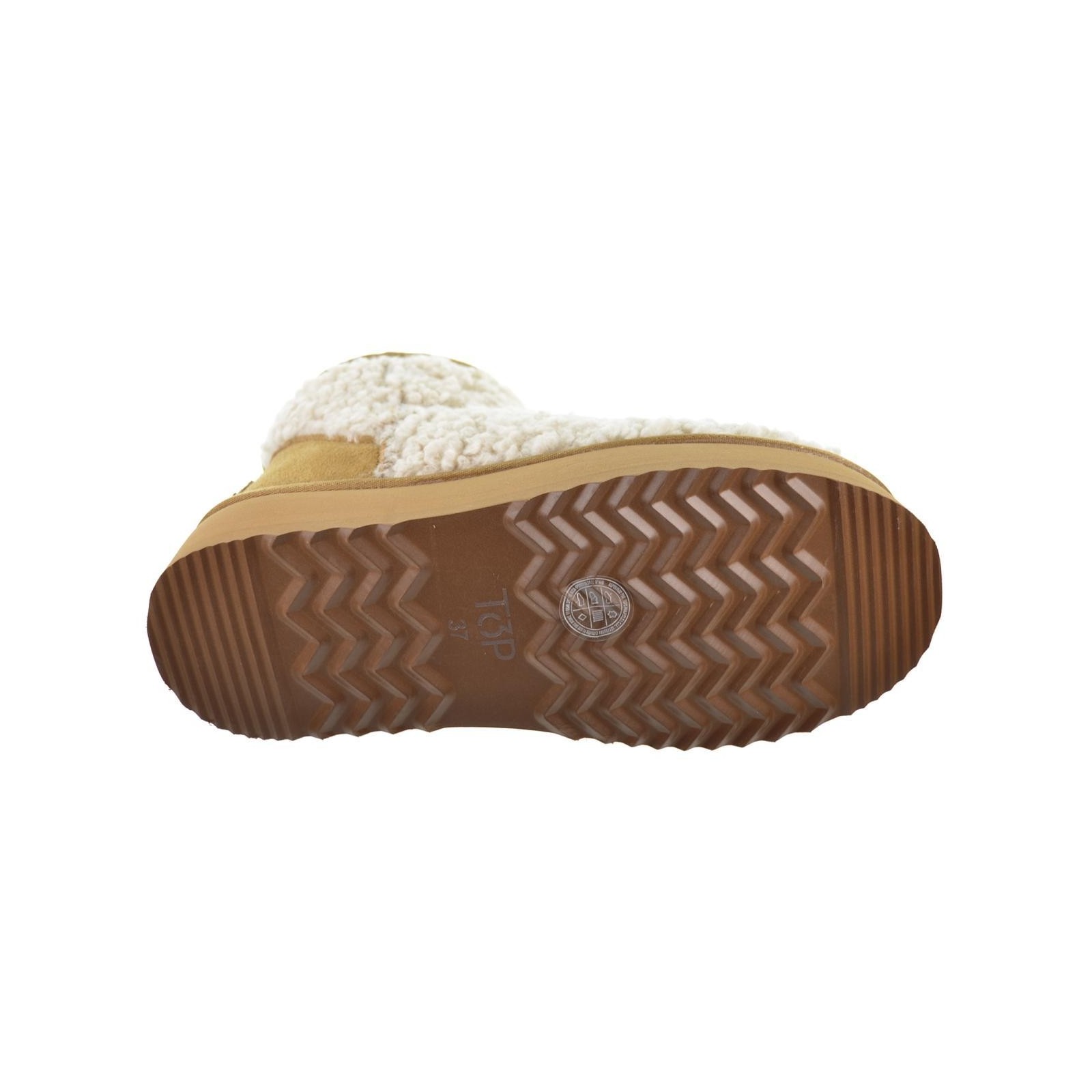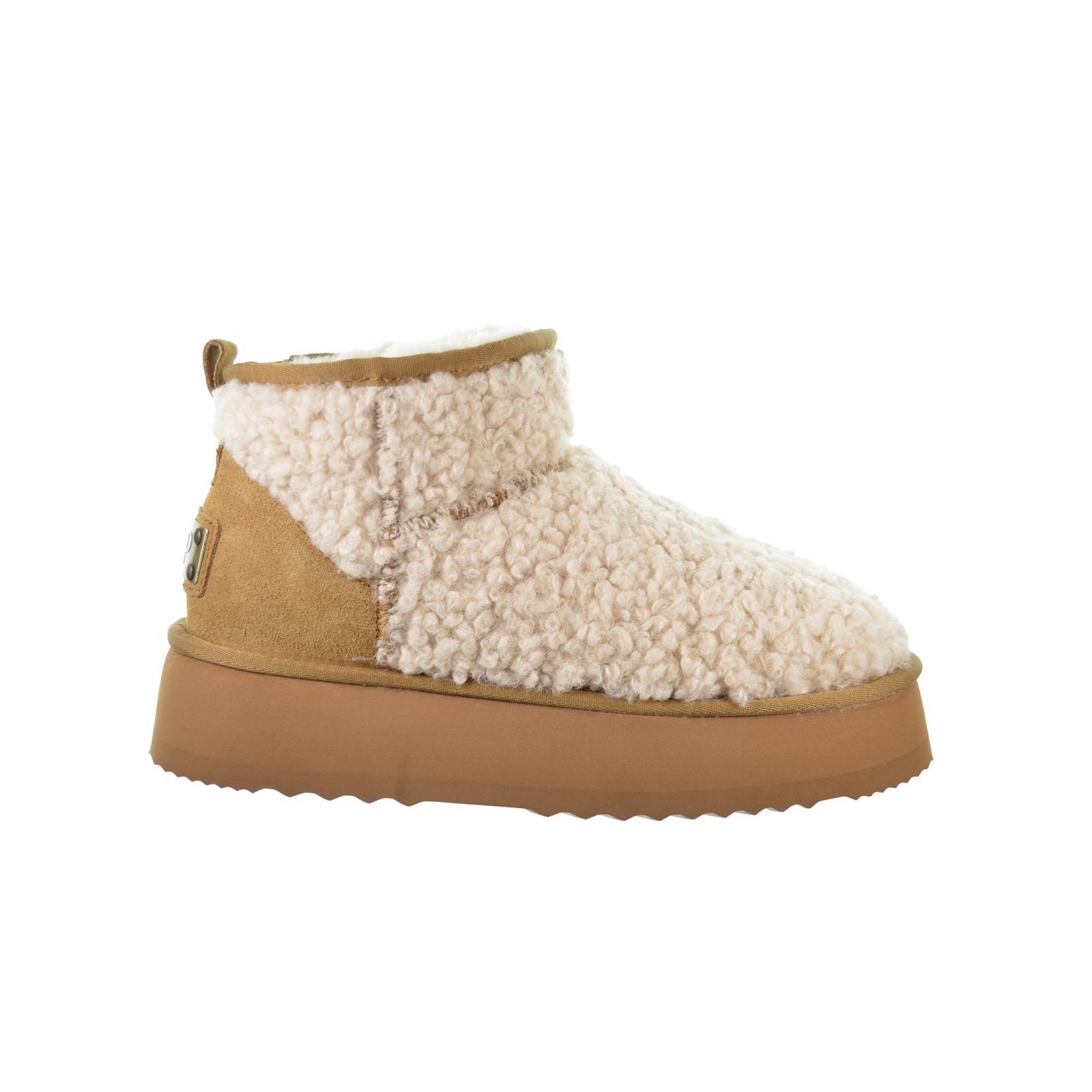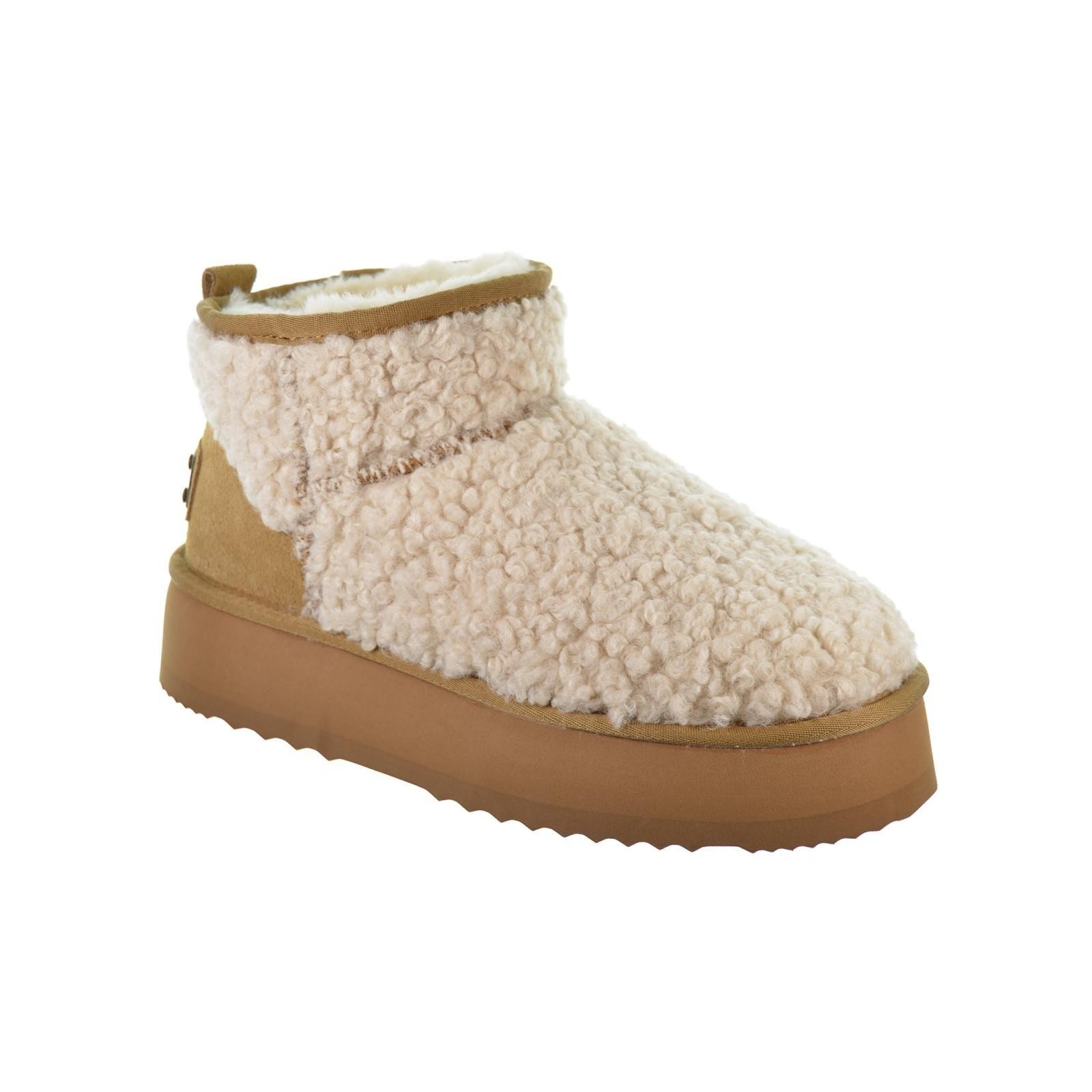 Top3 24874. Botín en material textil borreguillo con talón en serraje. Forrado interior de pelo sintético muy suave. Suela plataforma con altura de 4cm en Eva Termoconformada. Ya puedes ir a la moda y disfrutar de unas botas calentitas para los días más fríos de invierno.