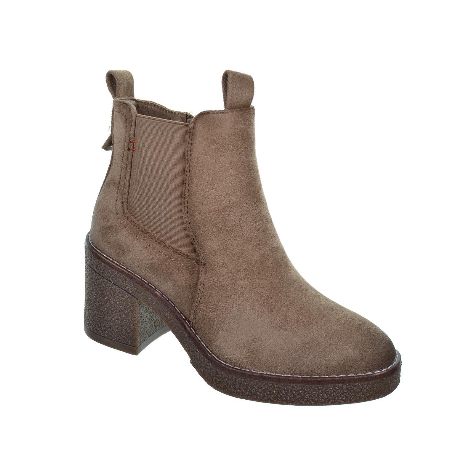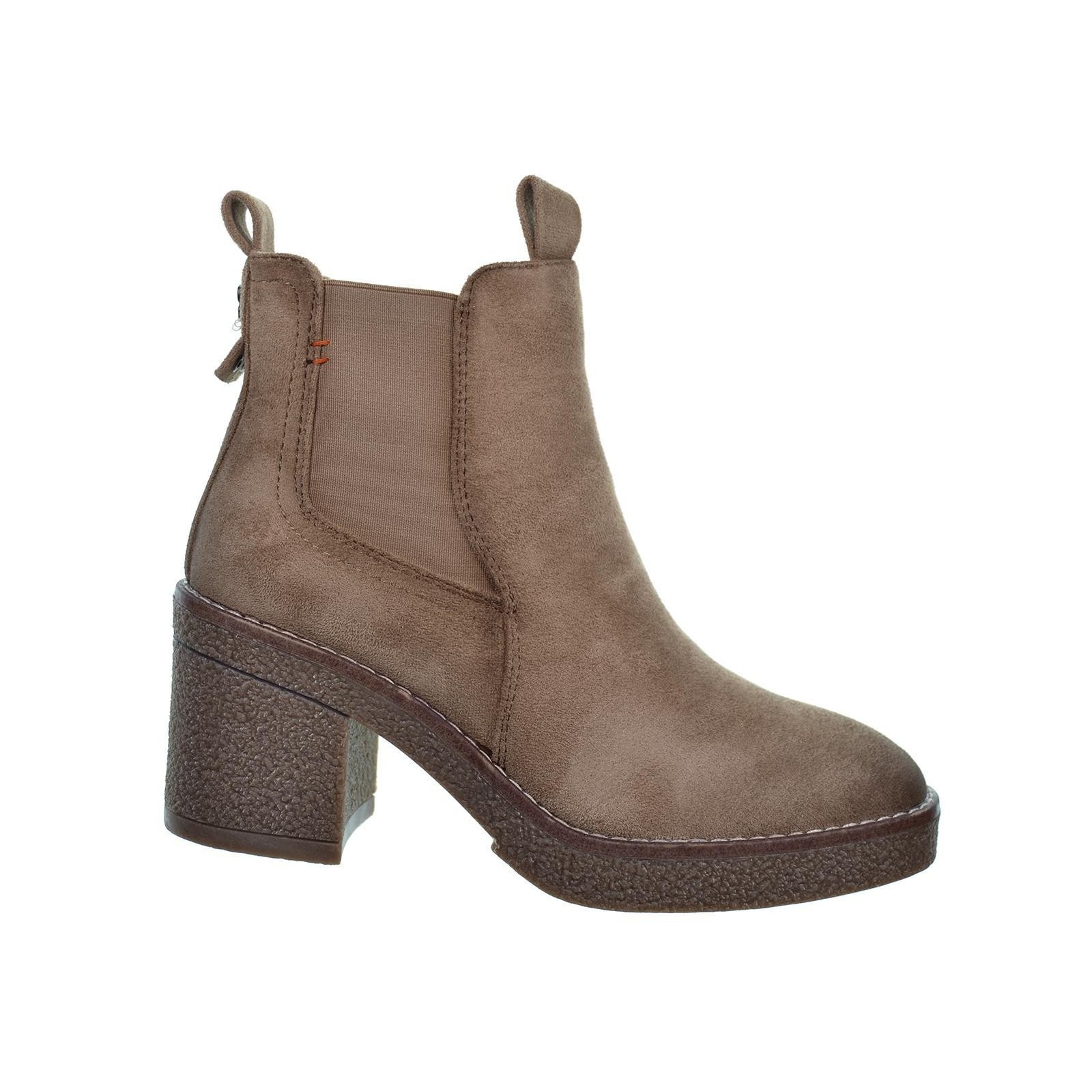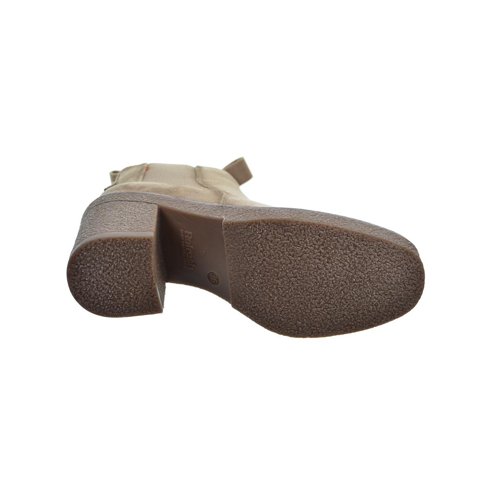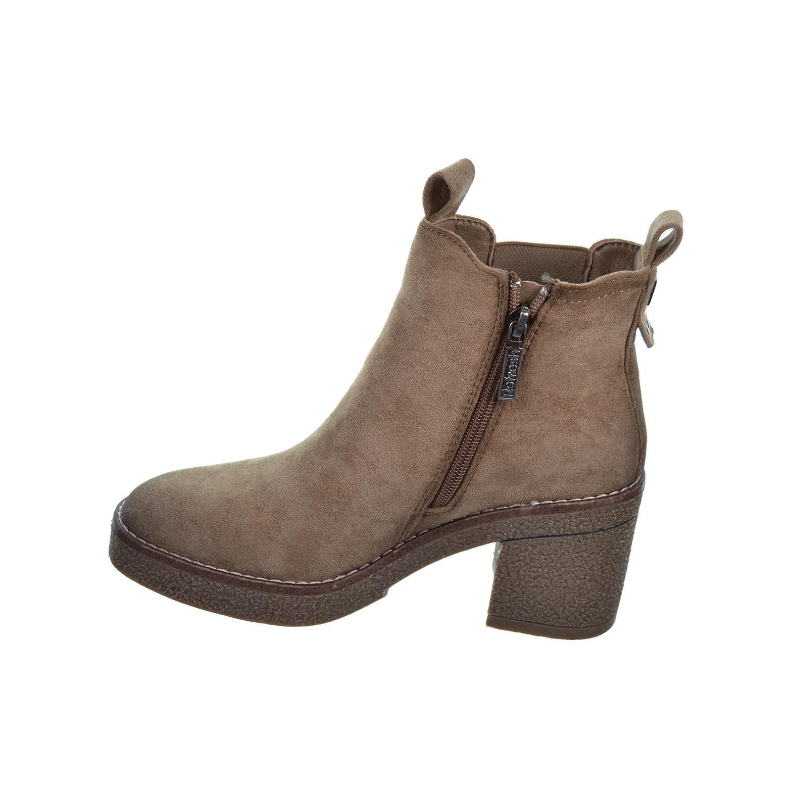 170990 Refresh. Botín antelina, forro interior en textil. Cierre con cremallera interior y elástico lateral exterior. Piso de goma con tacón ancho de 7cm. antideslizante. Un estilo muy versátil para combinar con tu look en invierno.