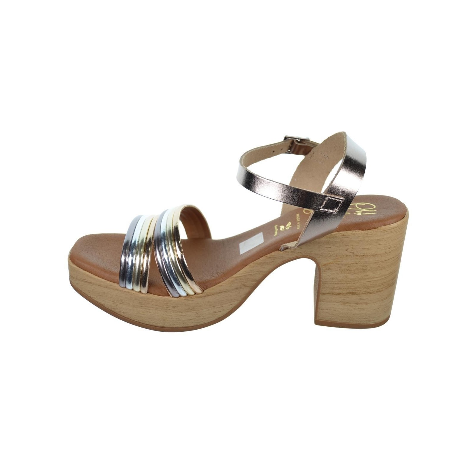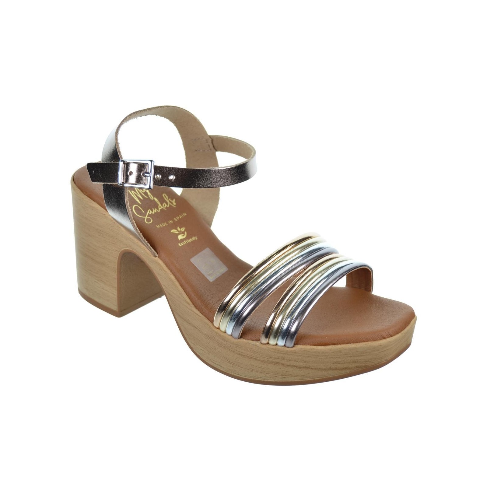 Oh! My Sandals 5392 Sandalia material en piel metalizada con tiras de diferentes colores. Plantilla Eco Friendly muy confortable, cierre en pulsera con hebilla regulable. Piso de poliuretano con tacón ancho de 8cm y plataforma de 2,5cm. Ideal para combinar con tu outfit este verano.