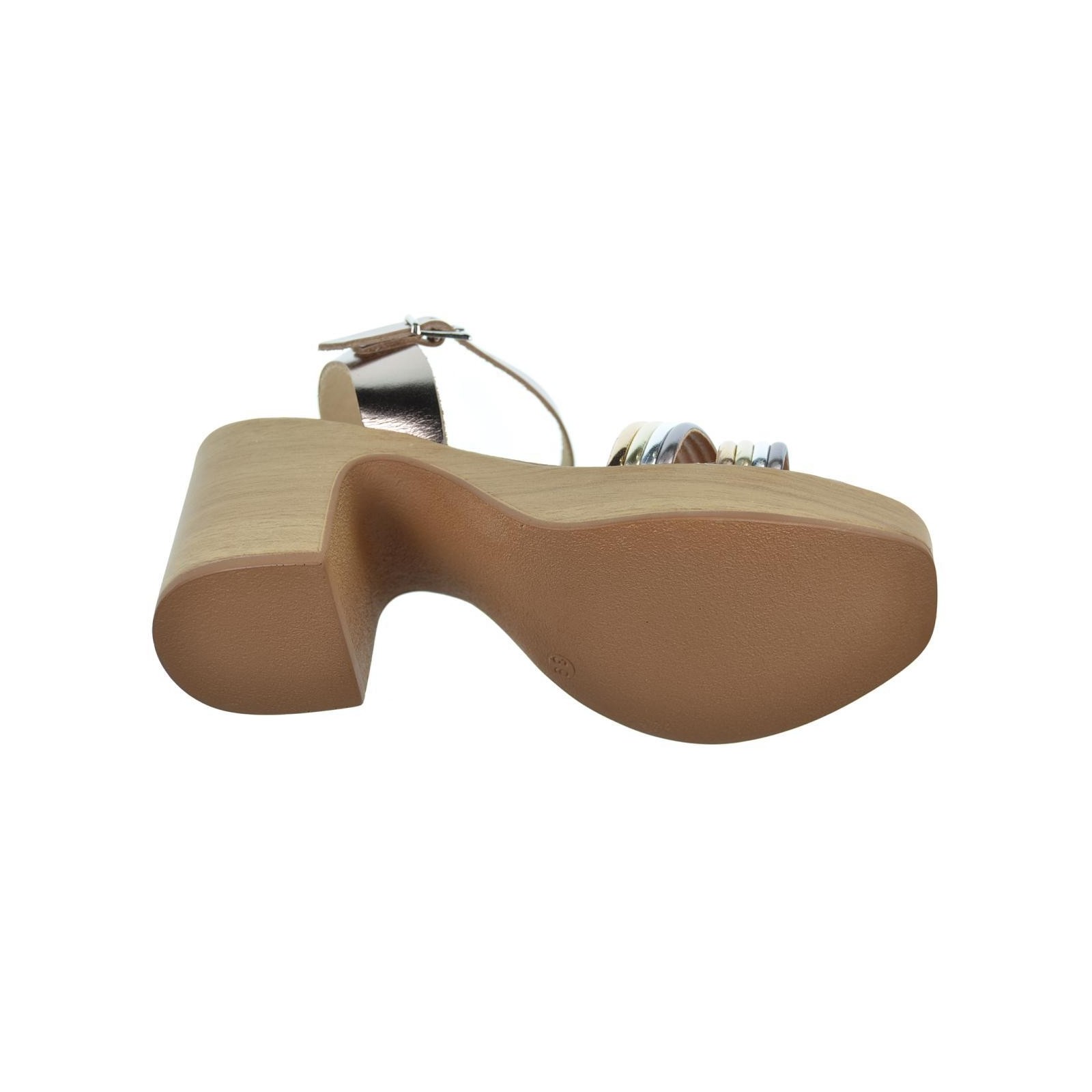 - Atributos: Tipo de Tacón TACON ALTO, Cierre HEBILLA, Tipo de piso PLATAFORMA, Acabado METALIZADO,