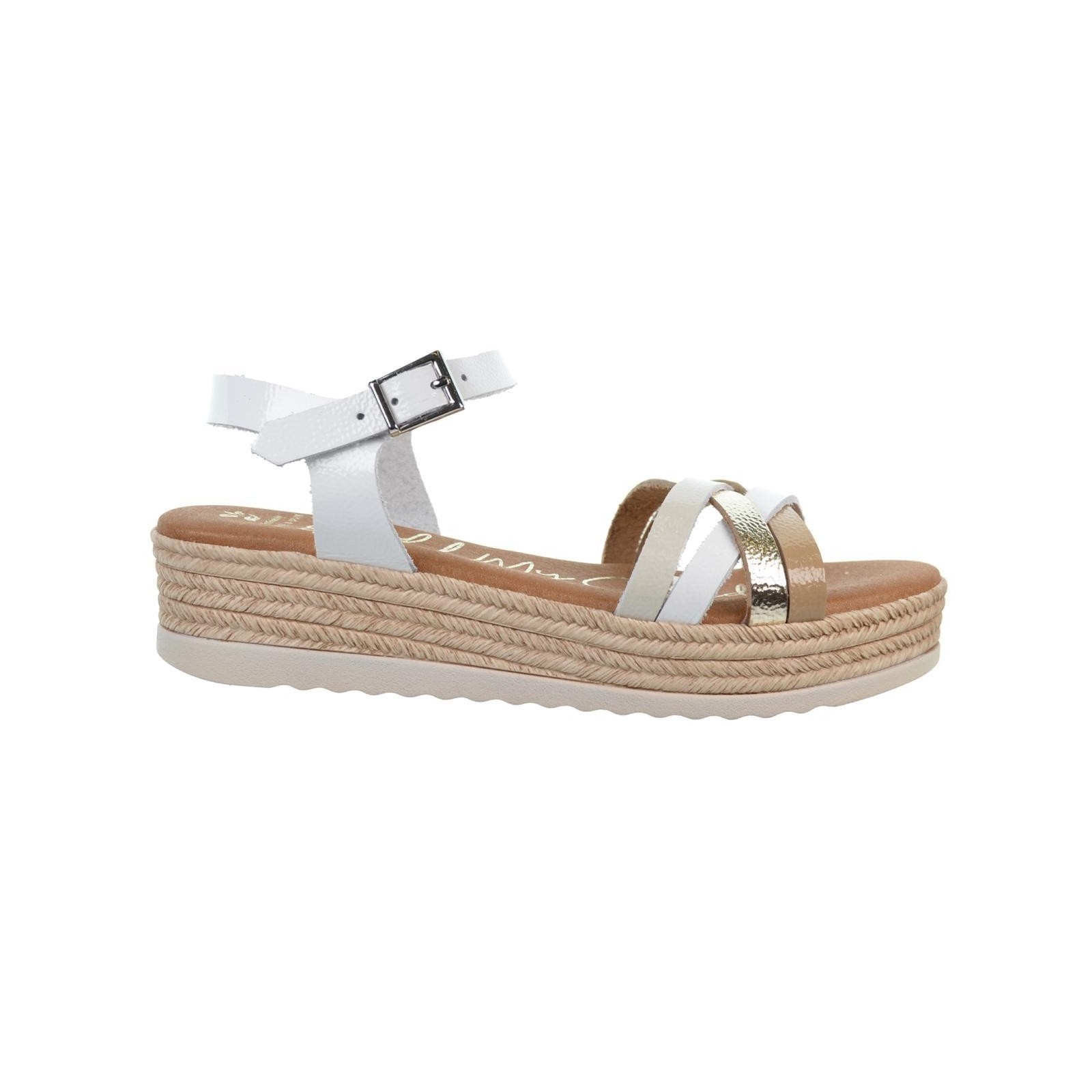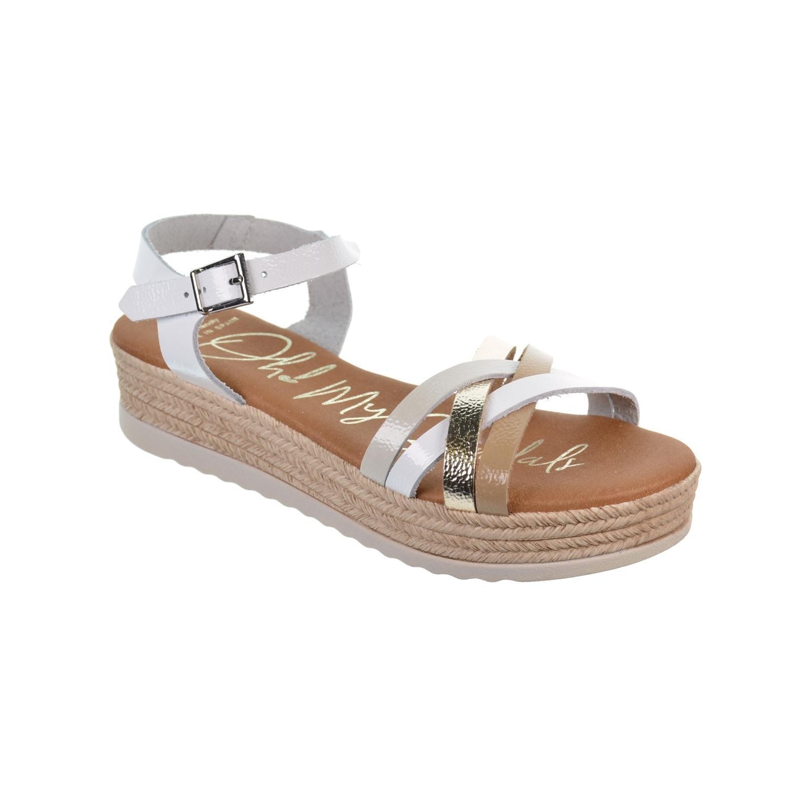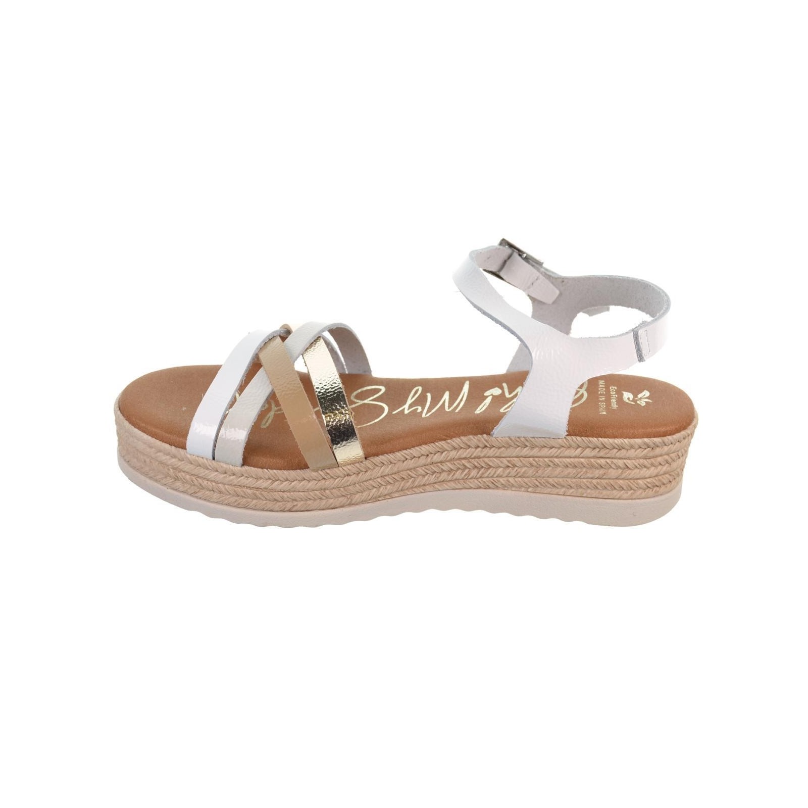 Oh! My Sandals 5690 Sandalia en piel charol y tiras cruzadas en empeine con diferentes colores. Plantilla textil Eco Friendly muy confortable y cierre en pulsera con hebilla regulable. Suela poliuretano e imitación yute con plataforma de 3´5cm. aprox. Ideal para combinar con tus vestidos este verano.