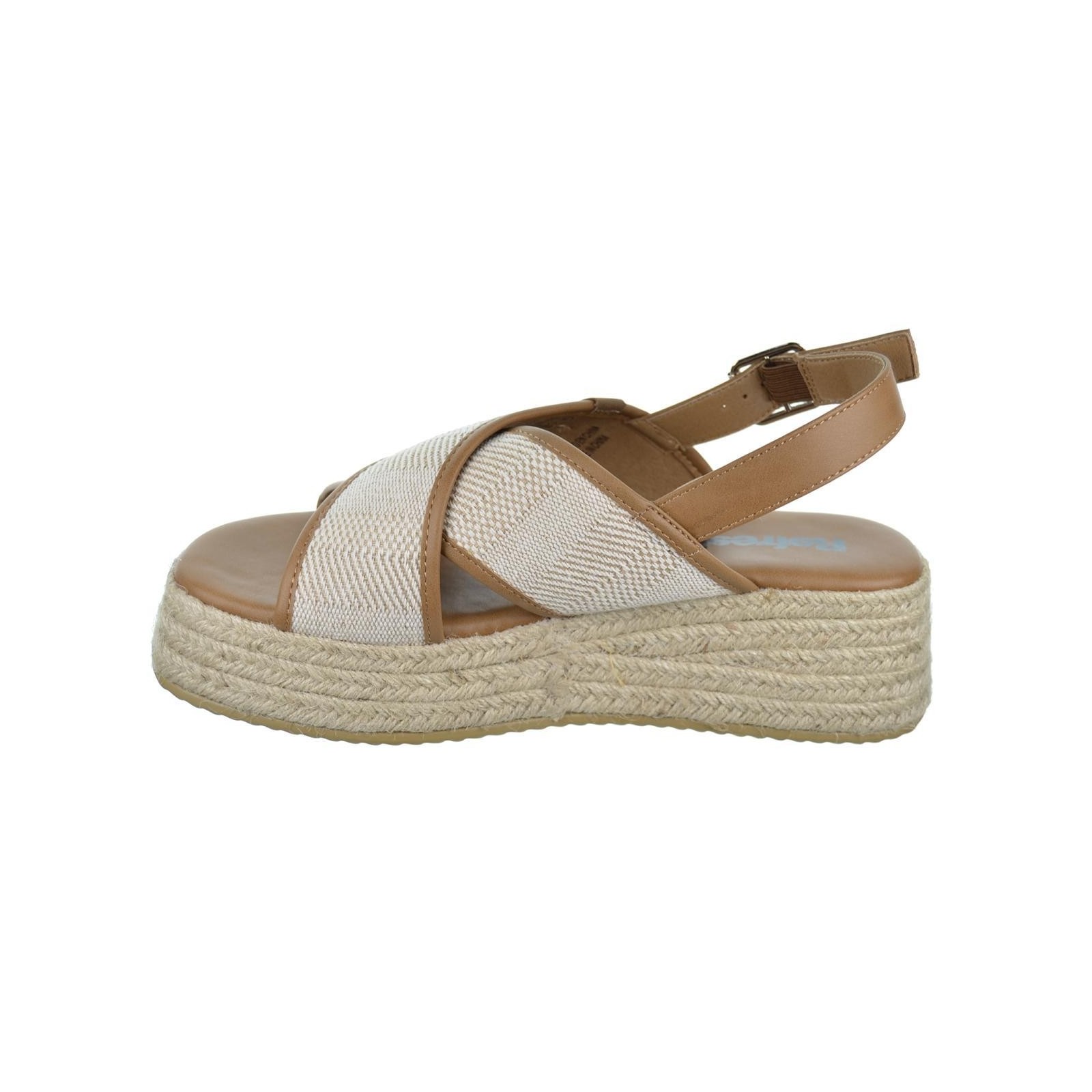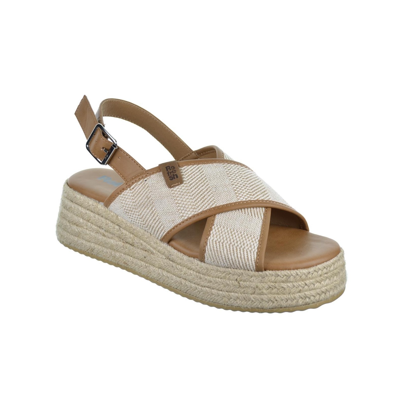 Refresh 171756 Sandalia Fabricada en textil y material que imita la piel. Cierre mediante hebilla. Cómoda planta acolchada. Plataforma de 5cm forrada en yute trenzado y suela antideslizante. Este modelo ha obtenido el certificado vegano por la organización mundial PETA (Organización de los derechos de los animales).