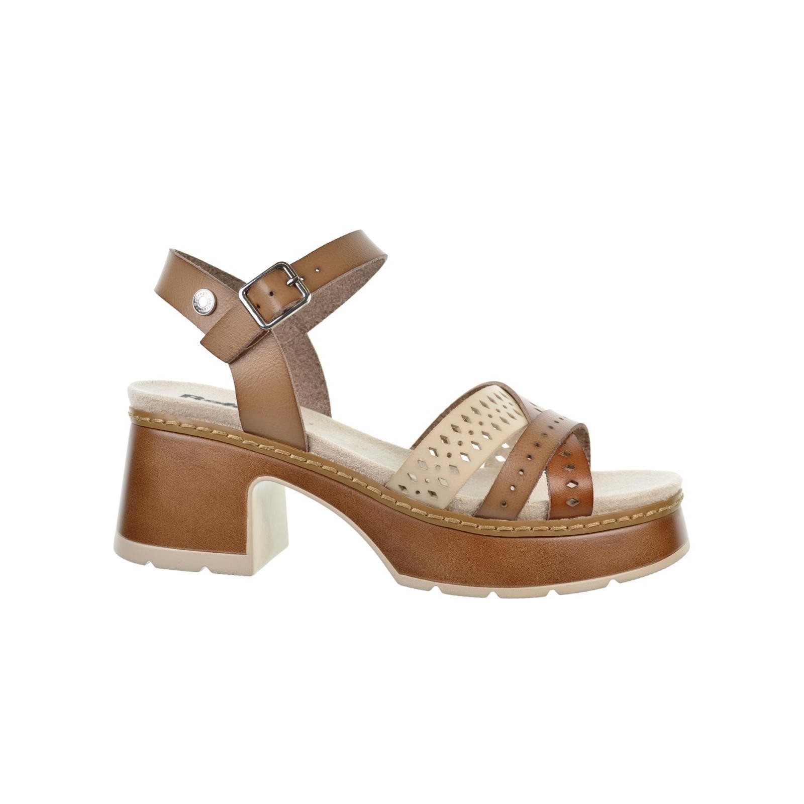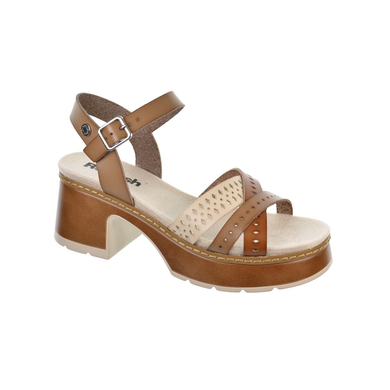 Refresh 172693 Sandalia en sintético perforado. Cierre mediante hebilla regulable. Forro y plantilla acolchada en textil. Tacón ancho de 6cm con plataforma de 2cm y suela de poliuretano. Este modelo ha obtenido el certificado vegano por la organización mundial PETA (Organización de los derechos de los animales).