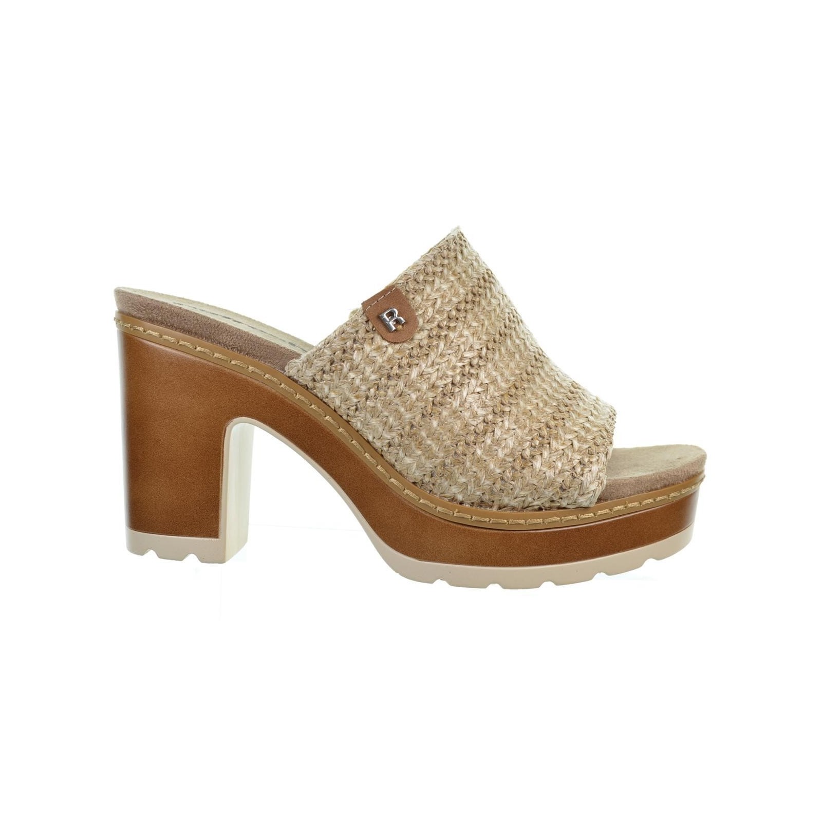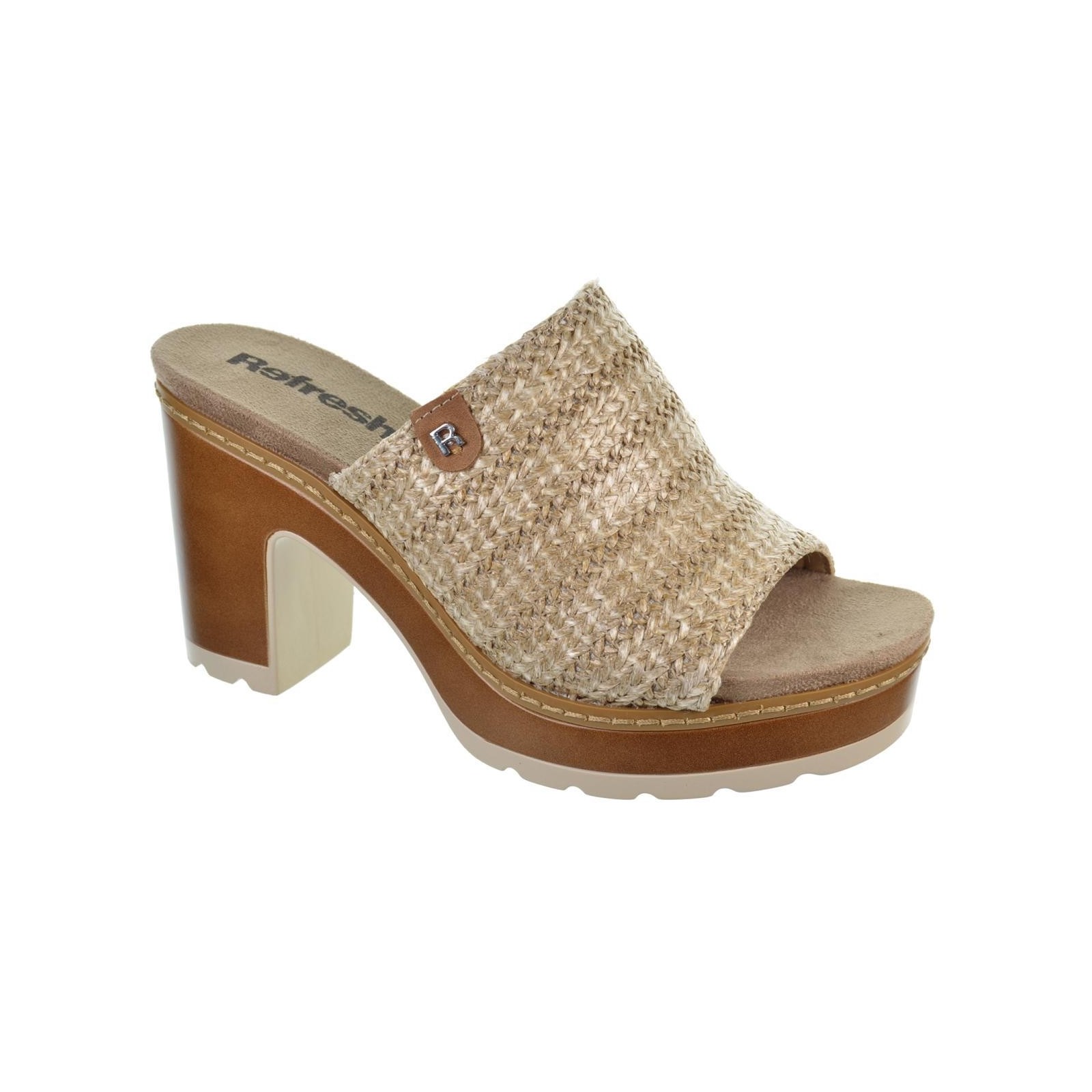 Refresh 172703 Sandalia tipo rafia. Forrado en sintético y plantilla acolchada en textil. Tacón ancho de 8cm con plataforma de 2cm. Suela P.U con goma antideslizante. Este modelo ha obtenido el certificado vegano por la organización mundial PETA (Organización de los derechos de los animales).