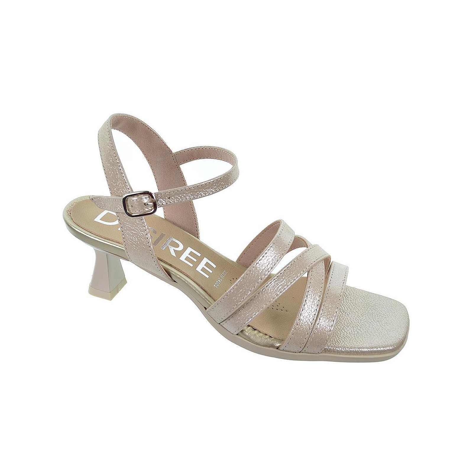 Alia7 Desireé Sandalia en piel con tiras cruzadas en pala, cierre en pulsera con hebilla regulable. Plantilla acolchada transpirable y ergonómica. Tacón de 5,5cm de altura con suela de goma muy ligera y flexible.Ya puedes disfrutar de un calzado cómodo que no puede faltar en tu outfit, para eventos o ceremonias.