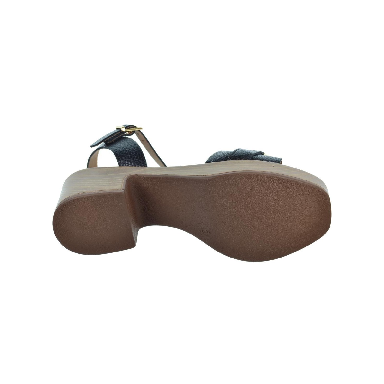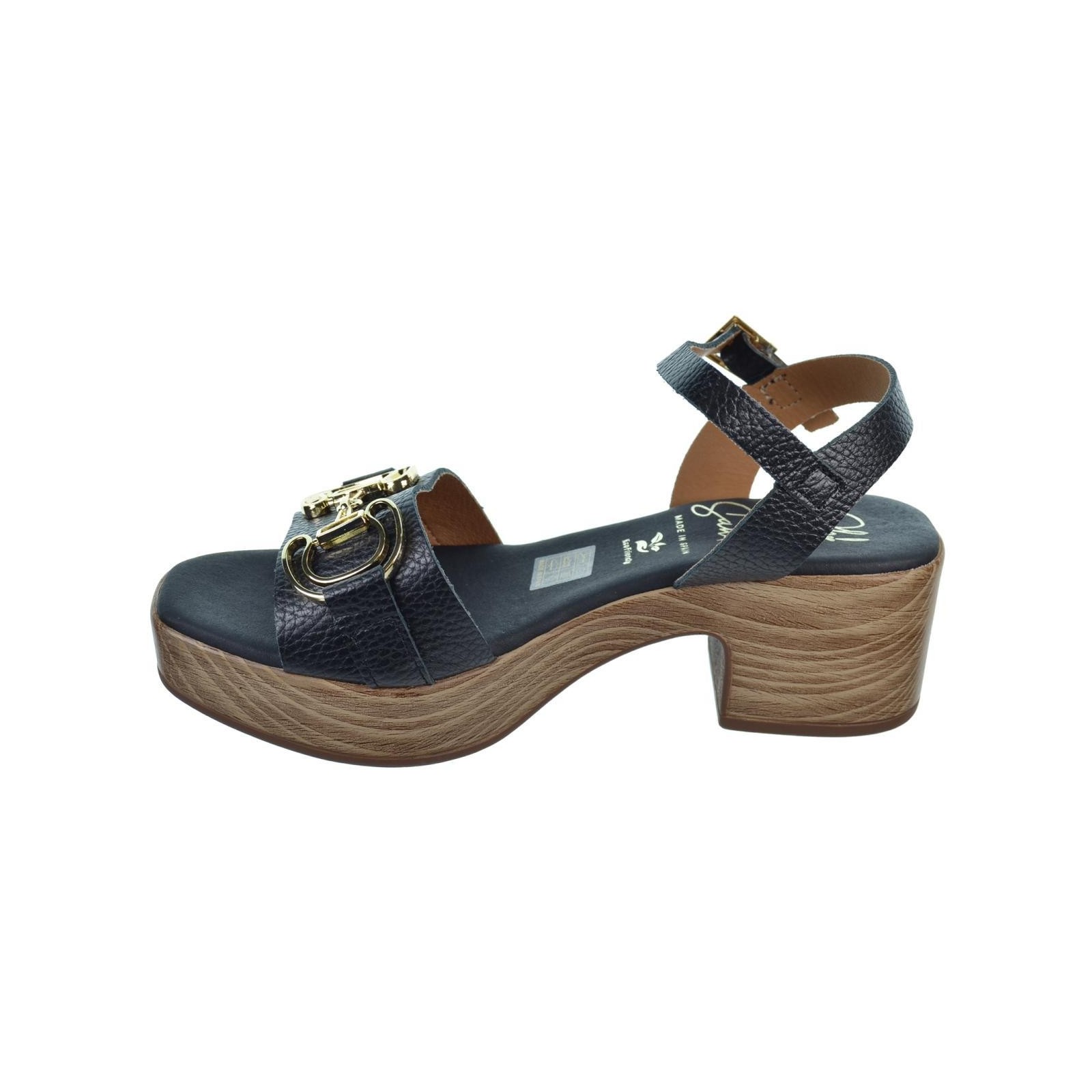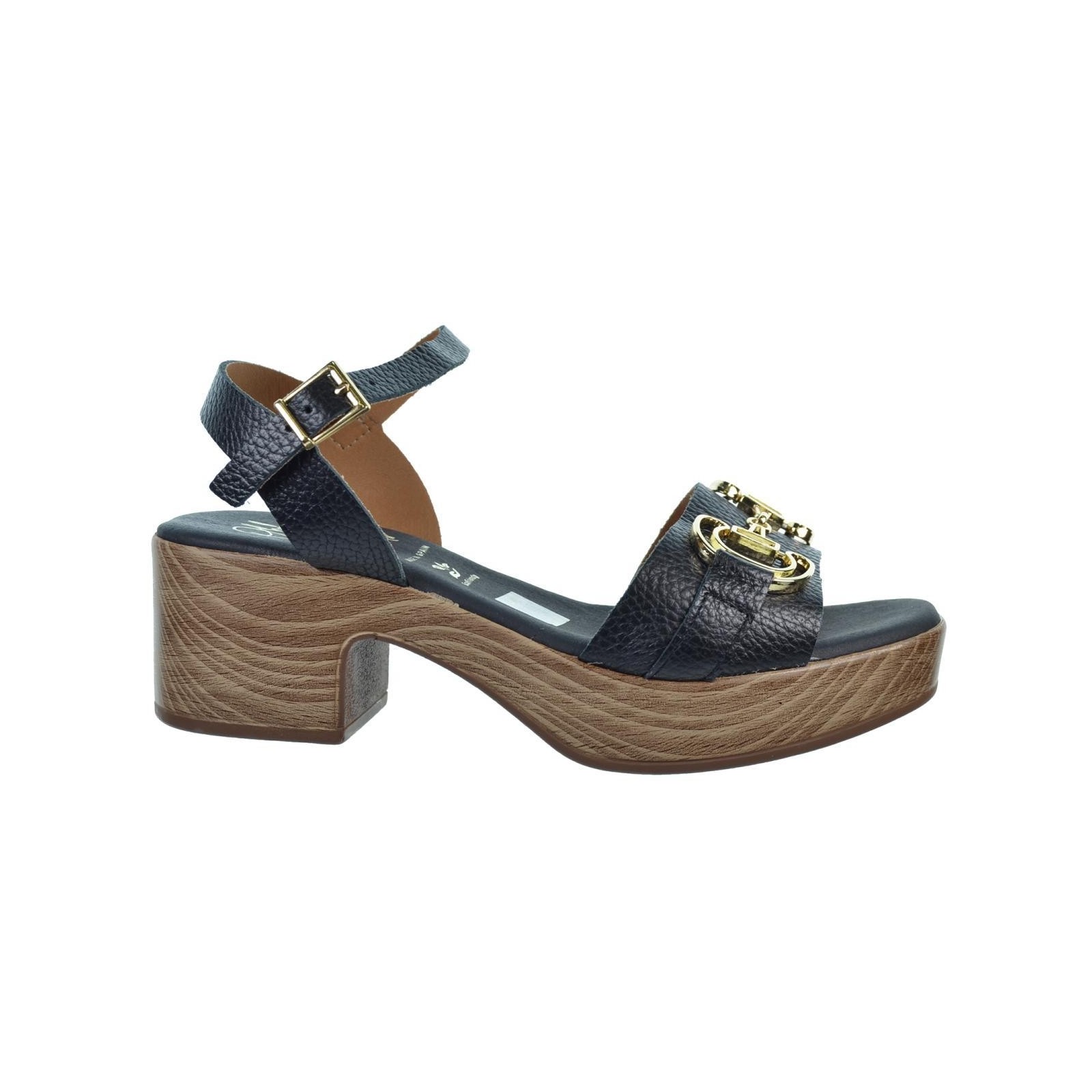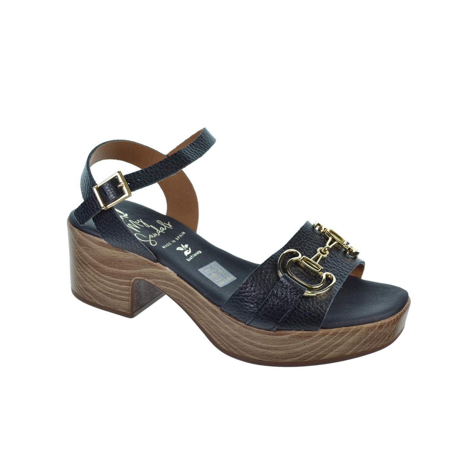 Oh! My Sandals 5626 Sandalia en piel con adorno metálico. Plantilla textil Eco Friendly muy confortable y cierre en pulsera con hebilla regulable. Piso poliuretano imitación madera, con tacón ancho de 5cm. y plataforma de 3cm. Ideal para combinar con tus vestidos este verano.