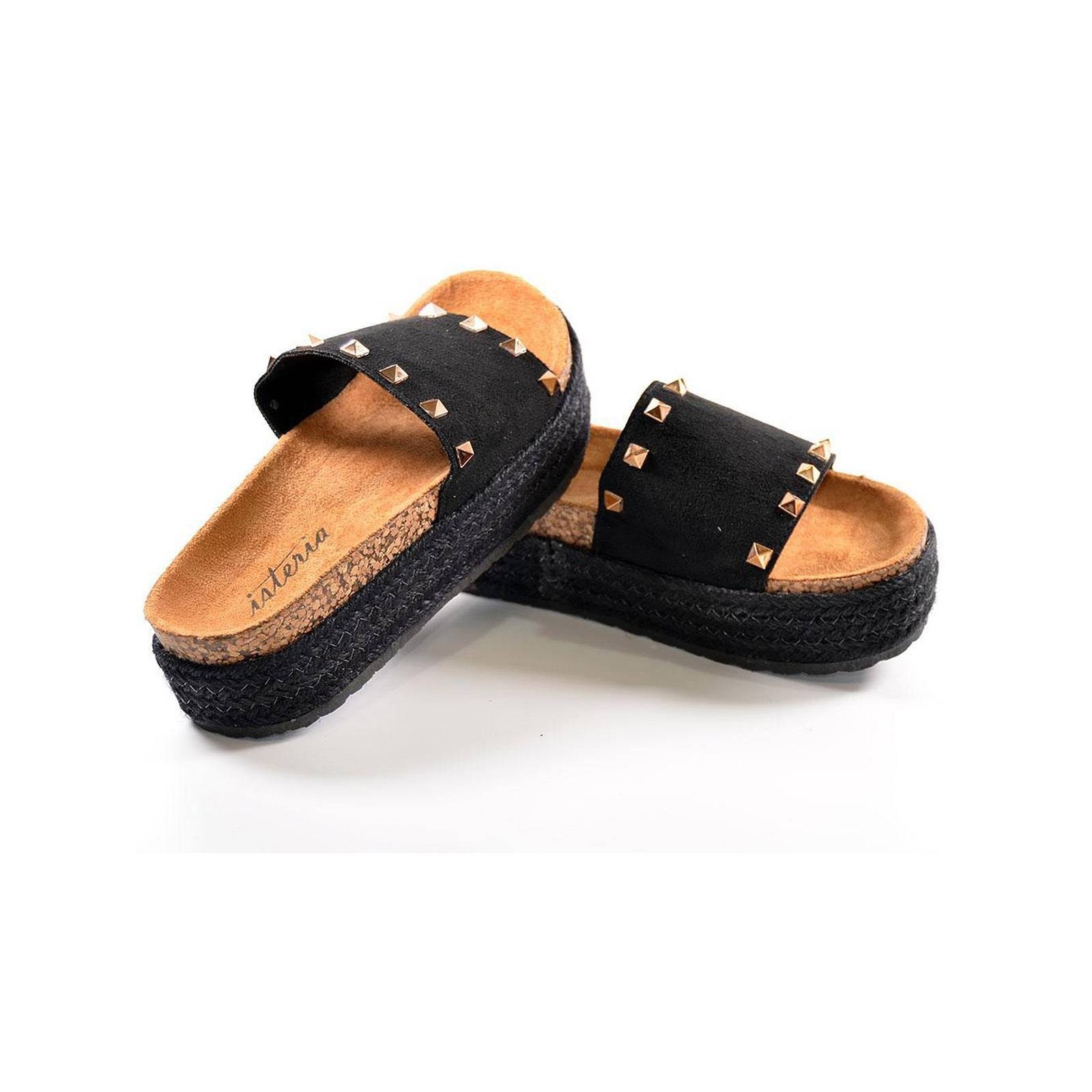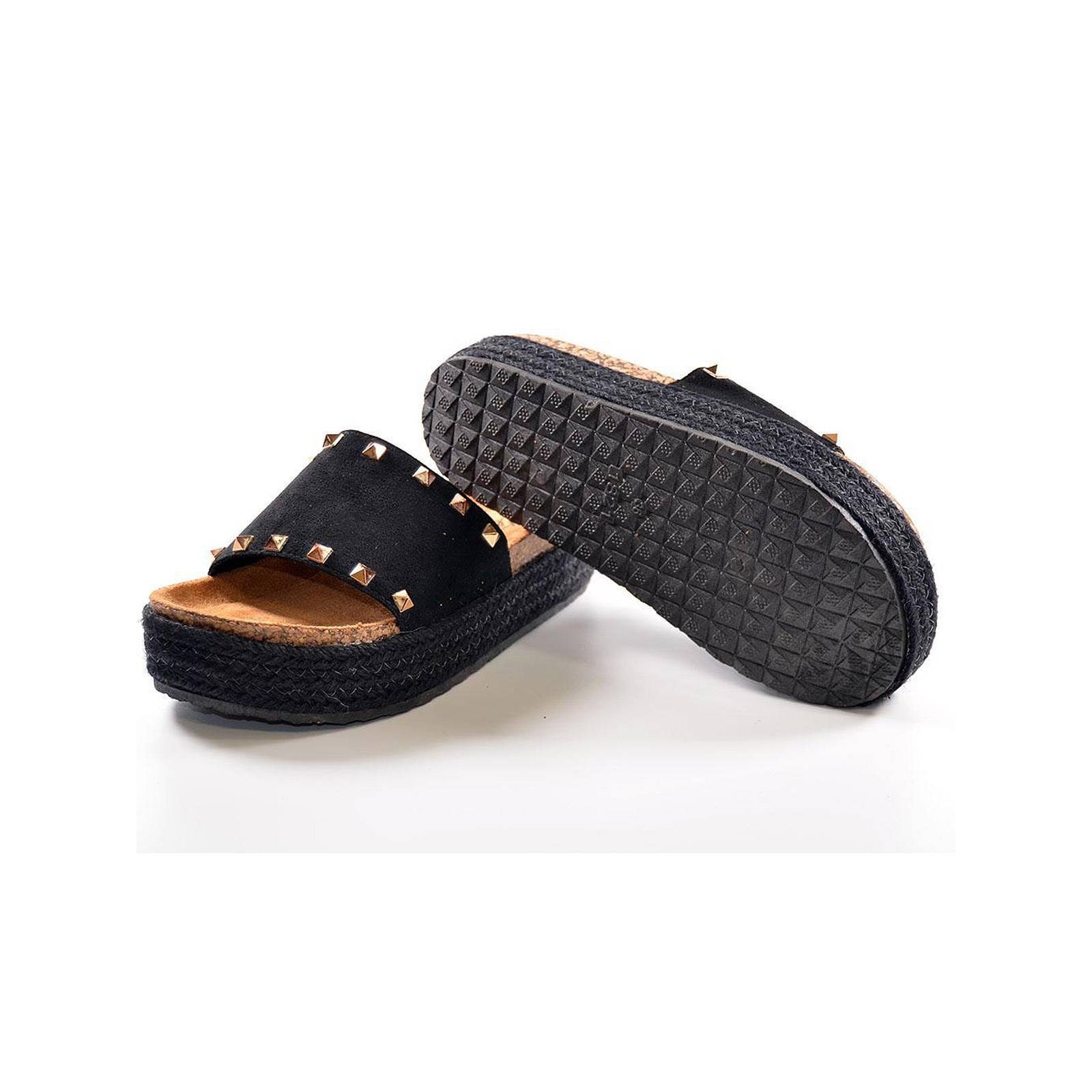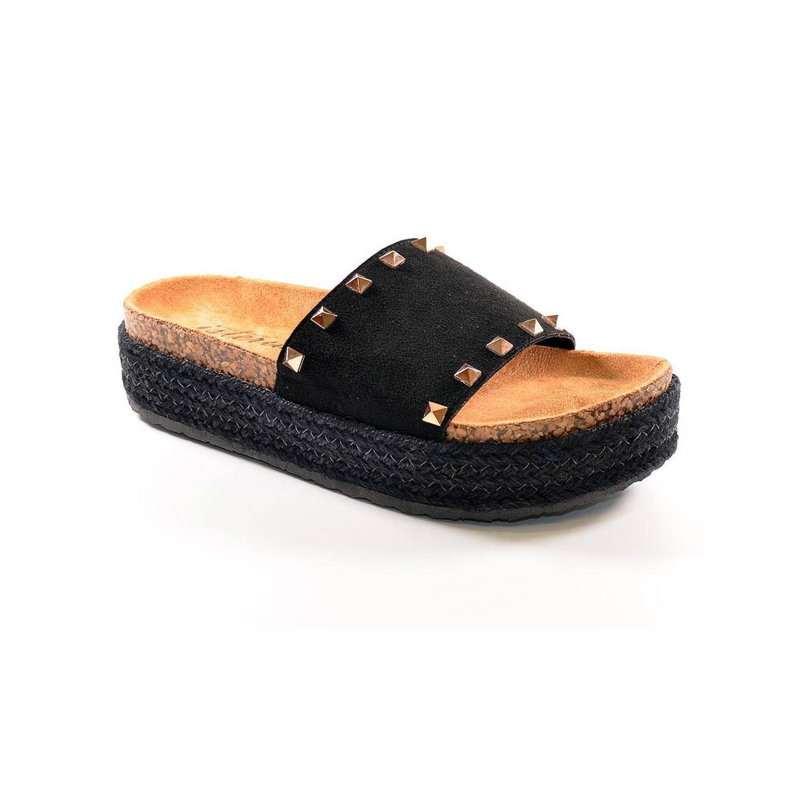 21053 Isteria. Chancla Zueco material antelina con pala ancha y remaches. Planta bio con piso plataforma forrado en yute. Ideal para combinar con tu look de verano.
