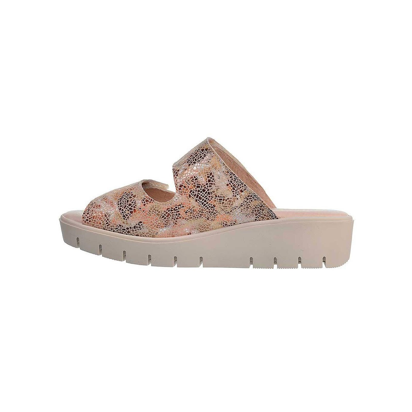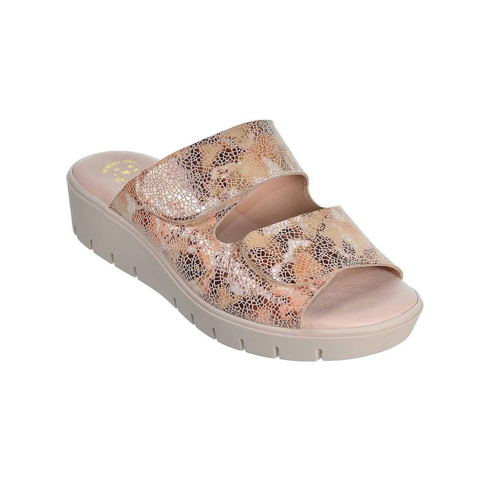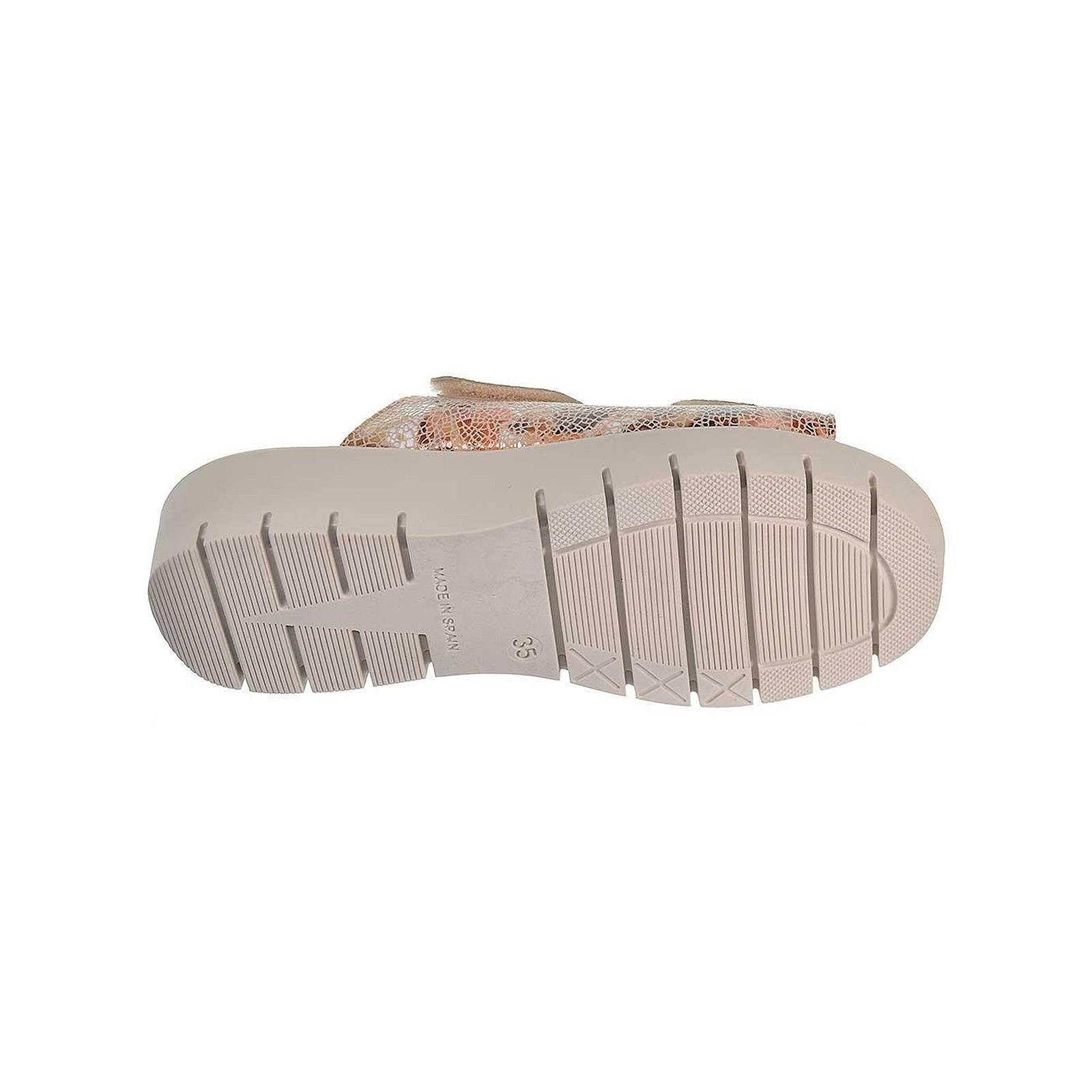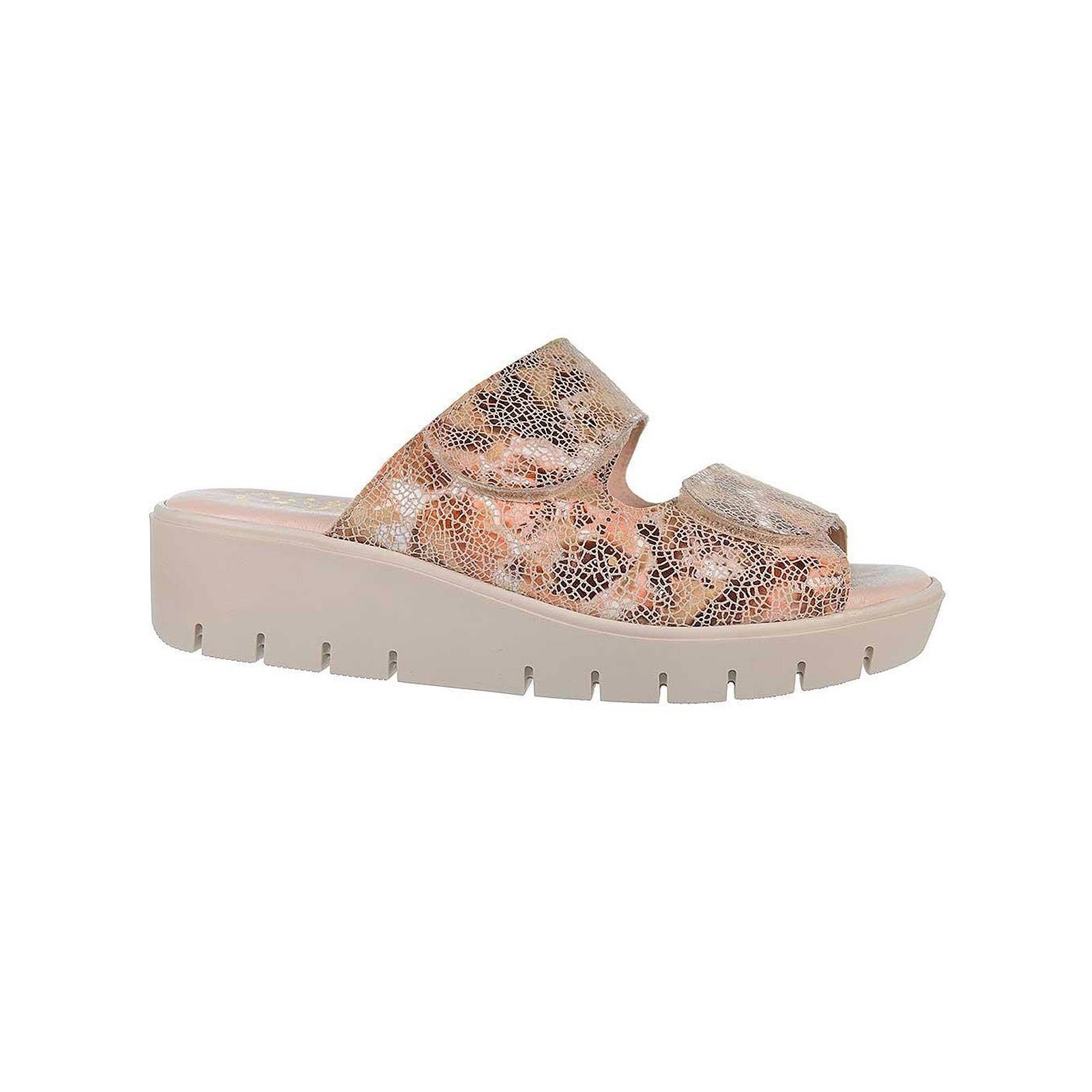 400 DUENDY. Sandalia tipo Zueco en material de piel grabado con diferentes tonos, forrado interior en piel y plantilla de piel confort. Cierre con doble velcro ajustable y piso con cuña de goma antideslizante.Ideal para pies delicados, por su comodidad y flexibilidad.
