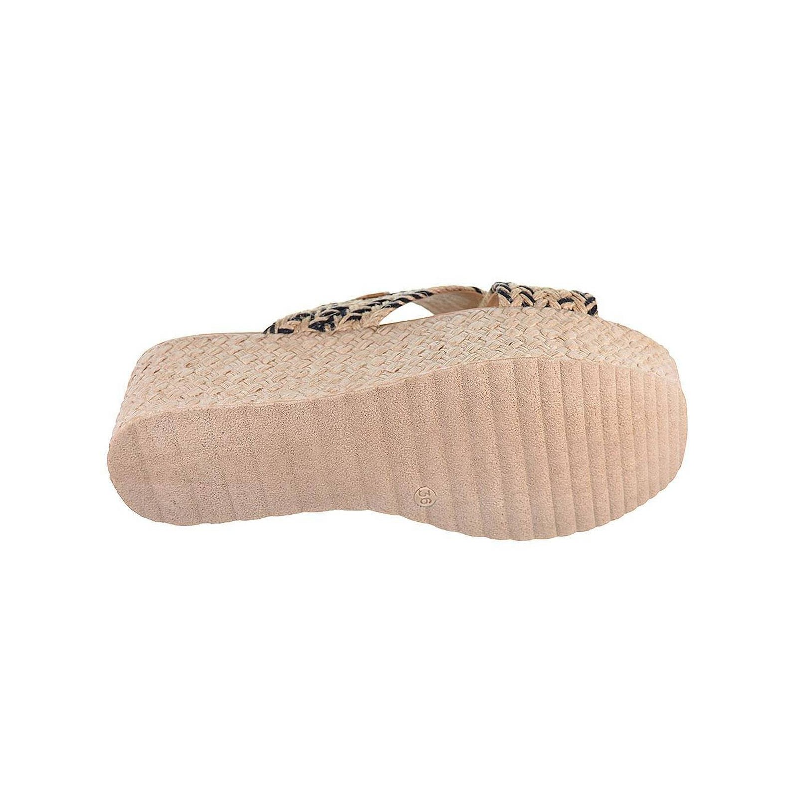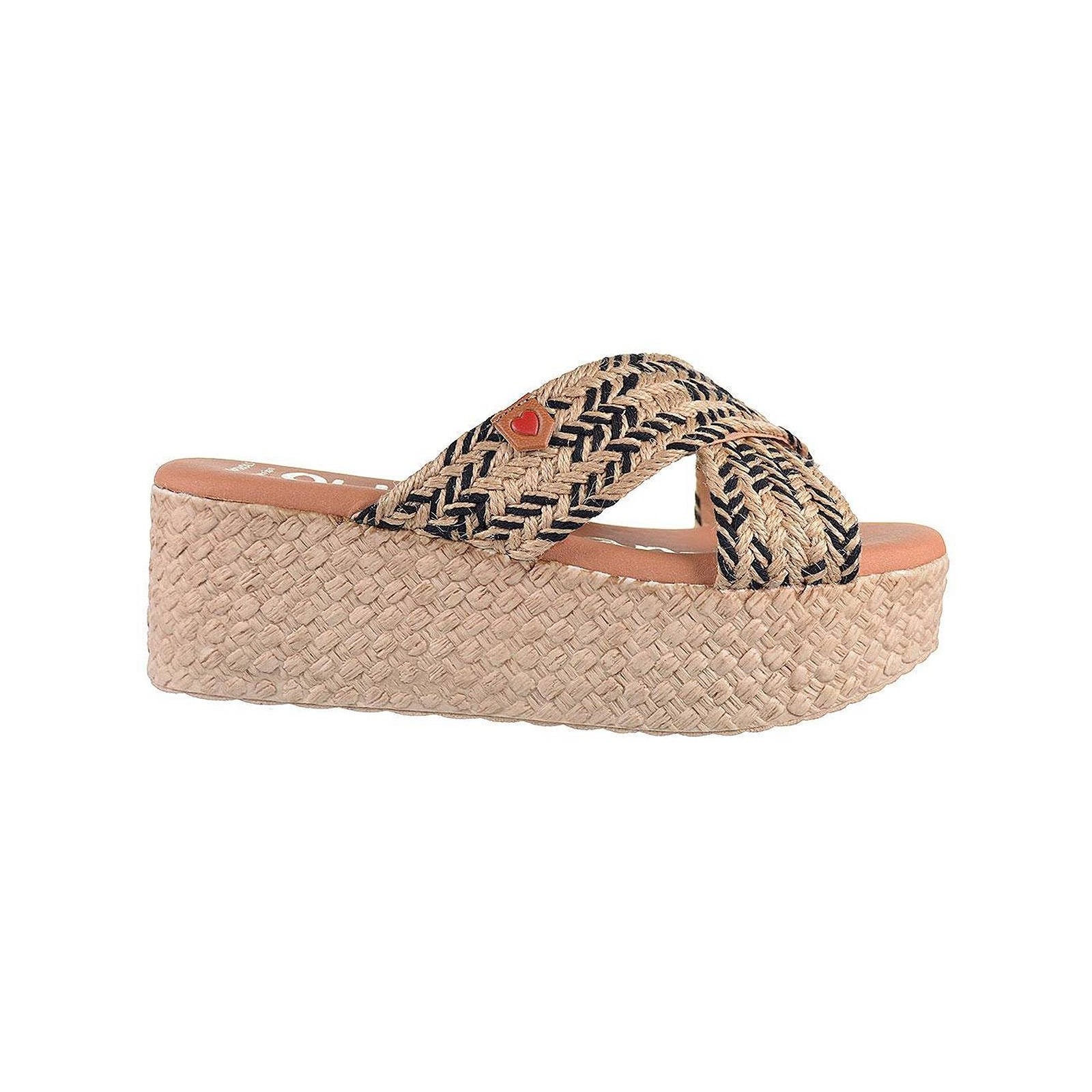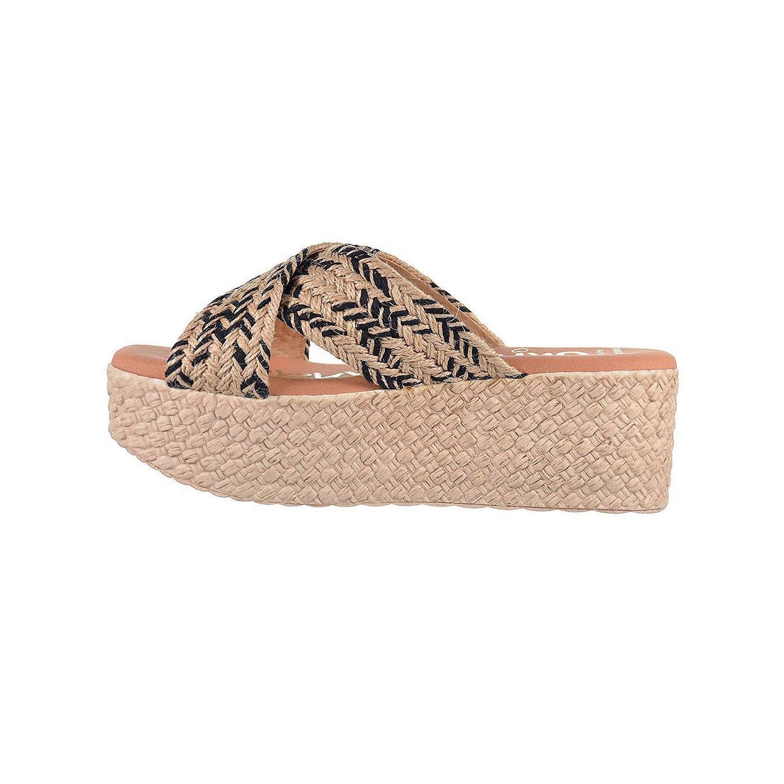 5058 Oh! My Sandals. Sandalia tipo Zueco con tiras cruzadas en rafia trenzada. Plantilla confort. Piso de poliuretano imitación yute con plataforma de 5cm. de altura aprox. Ideal para combinar con tus vestidos este verano.