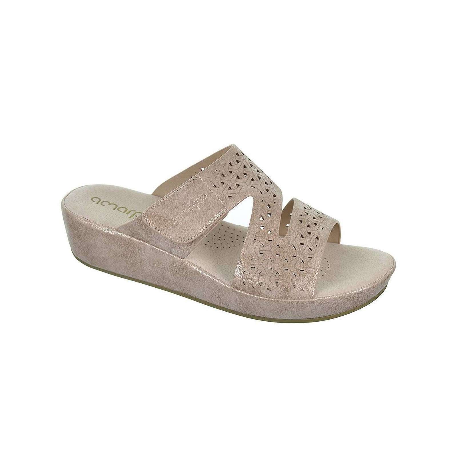 23589 Amarpies Zueco sintético perforado, forro interior textil y planta acolchada muy confortable. Cierre con velcro ajustable. Piso con cuña de 4cm.de altura, muy ligero y suela de goma antideslizante.Ideales para pies delicados.