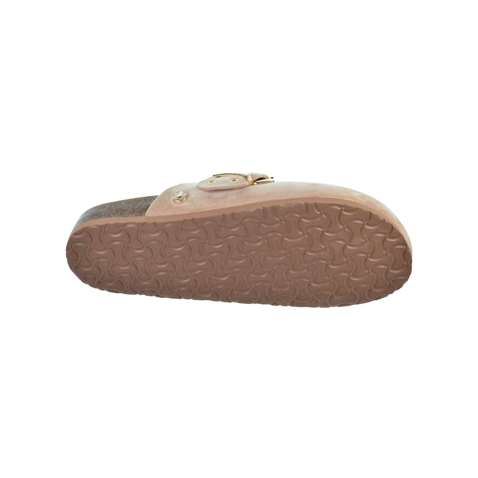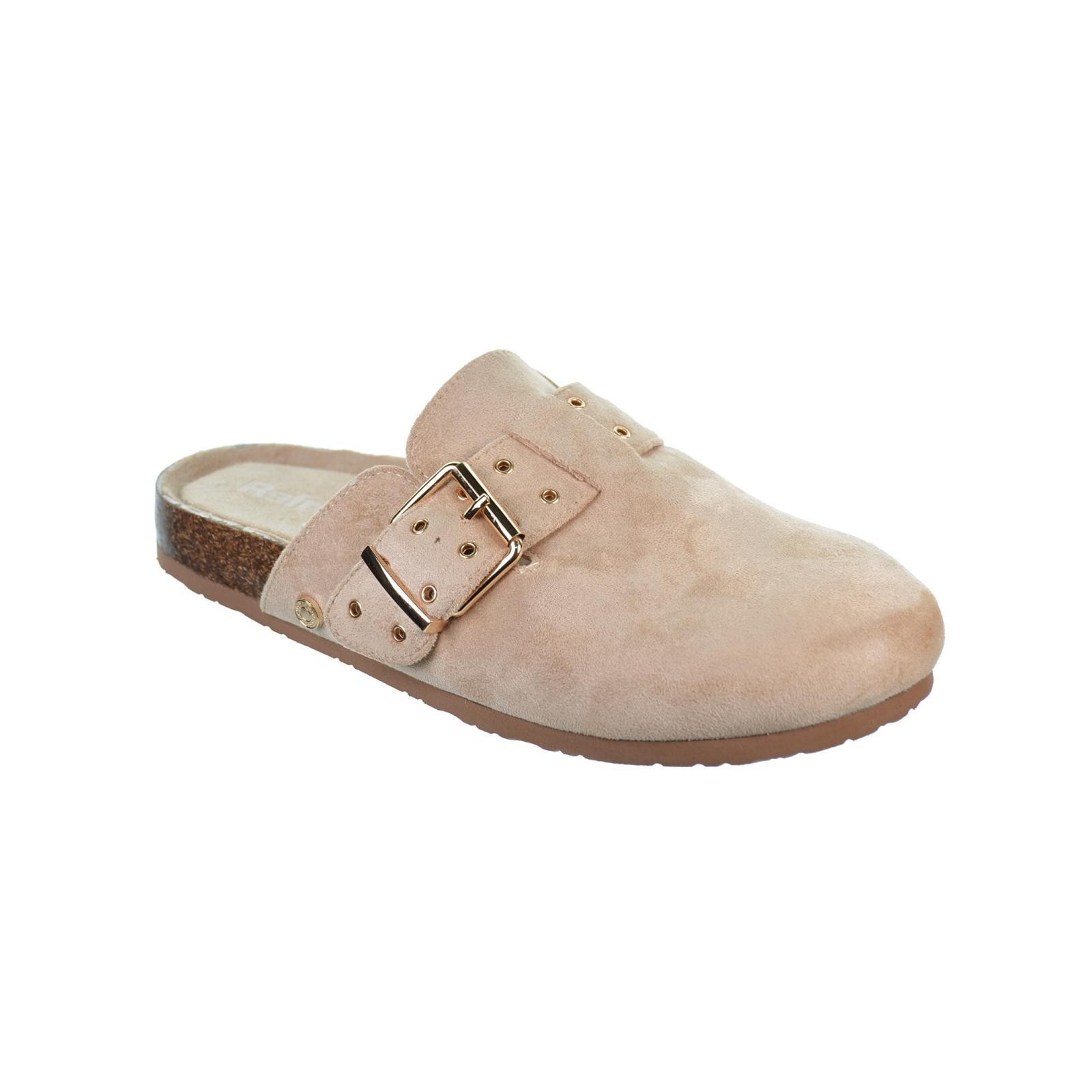 Refresh 172538 Zueco destalonado fabricado en suave antelina. Forro interior sintético y plantilla textil acolchada, muy confortable. Correa ajustable con hebilla en oro. Cómoda planta de bios con suela de eva termoconformada. Este modelo ha obtenido el certificado vegano por la organización mundial PETA (Organización de los derechos de los animales).