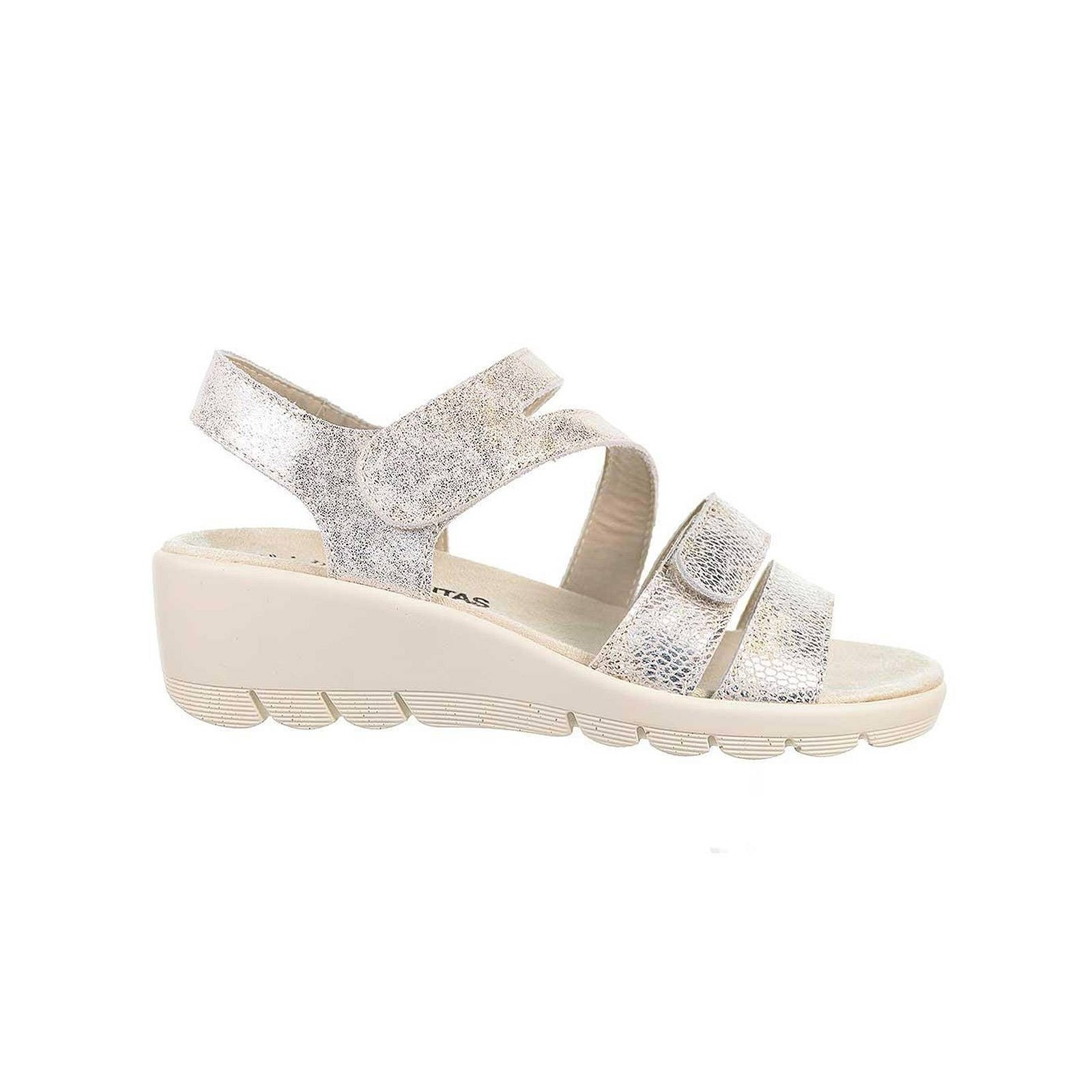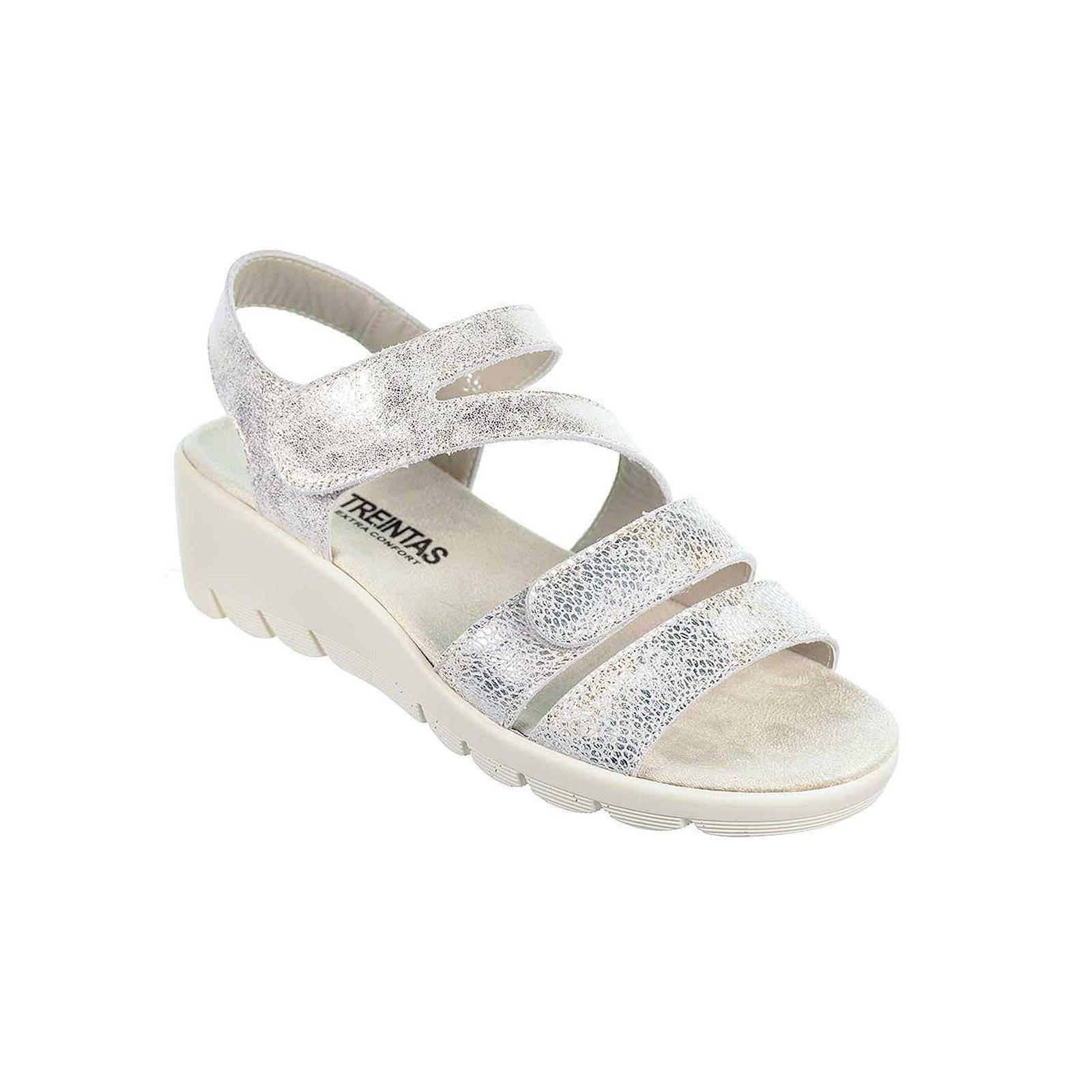 3730 TREINTAS 30s. Sandalia confort en material de piel y pala de doble tira con velcro. Cierre en empeine con velcro regulable y plantilla textil extraíble muy confortable. Piso con cuña de 5cm. de altura, muy ligero y flexible. Ideales para pies delicados.