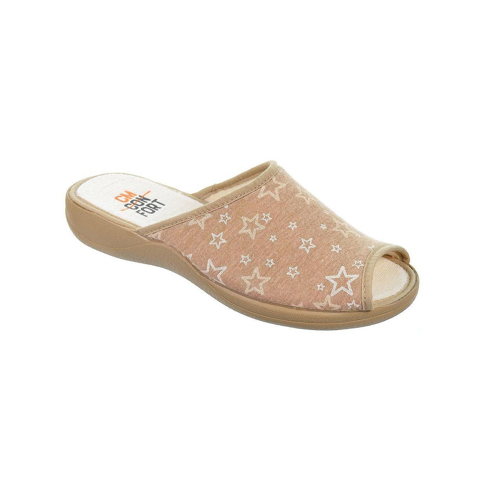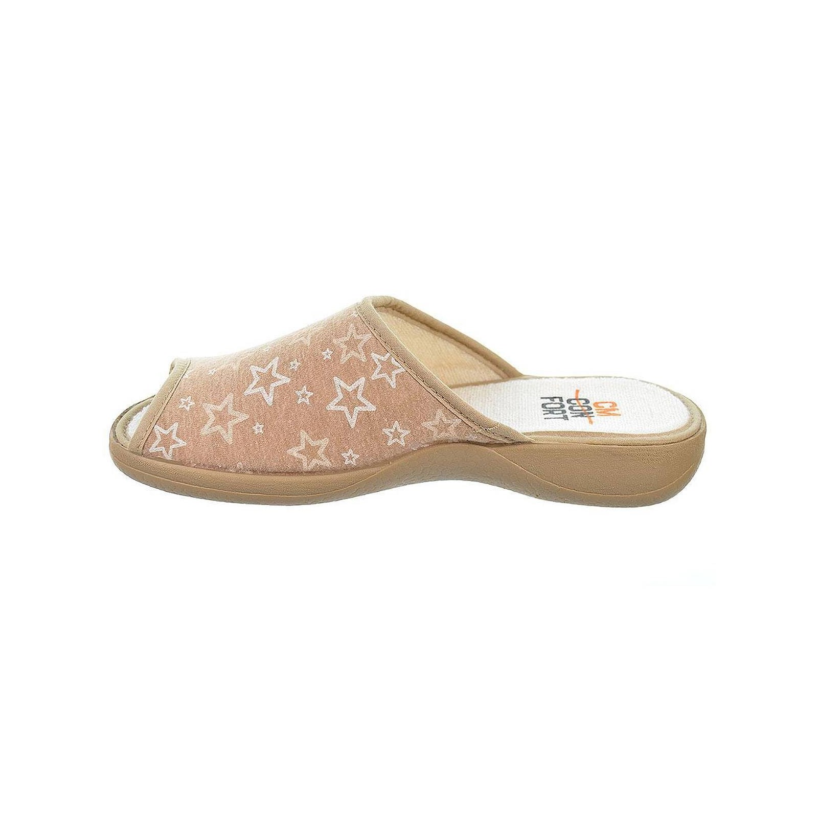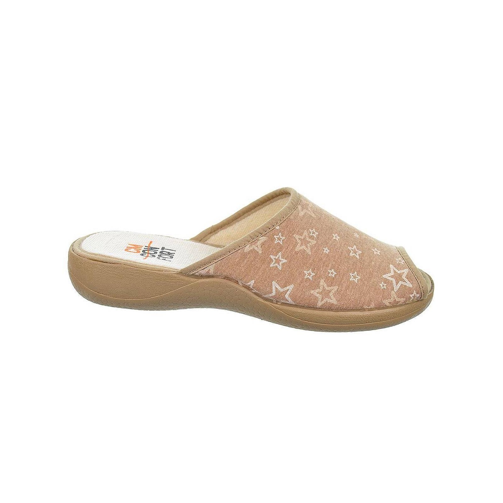 20243 CMCONFORT. Zapatilla textil destalonada con puntera abierta, plantilla textil acolchada para un máximo confort. Piso con cuña de goma antideslizante. Ideales para casa por su comodidad al caminar.