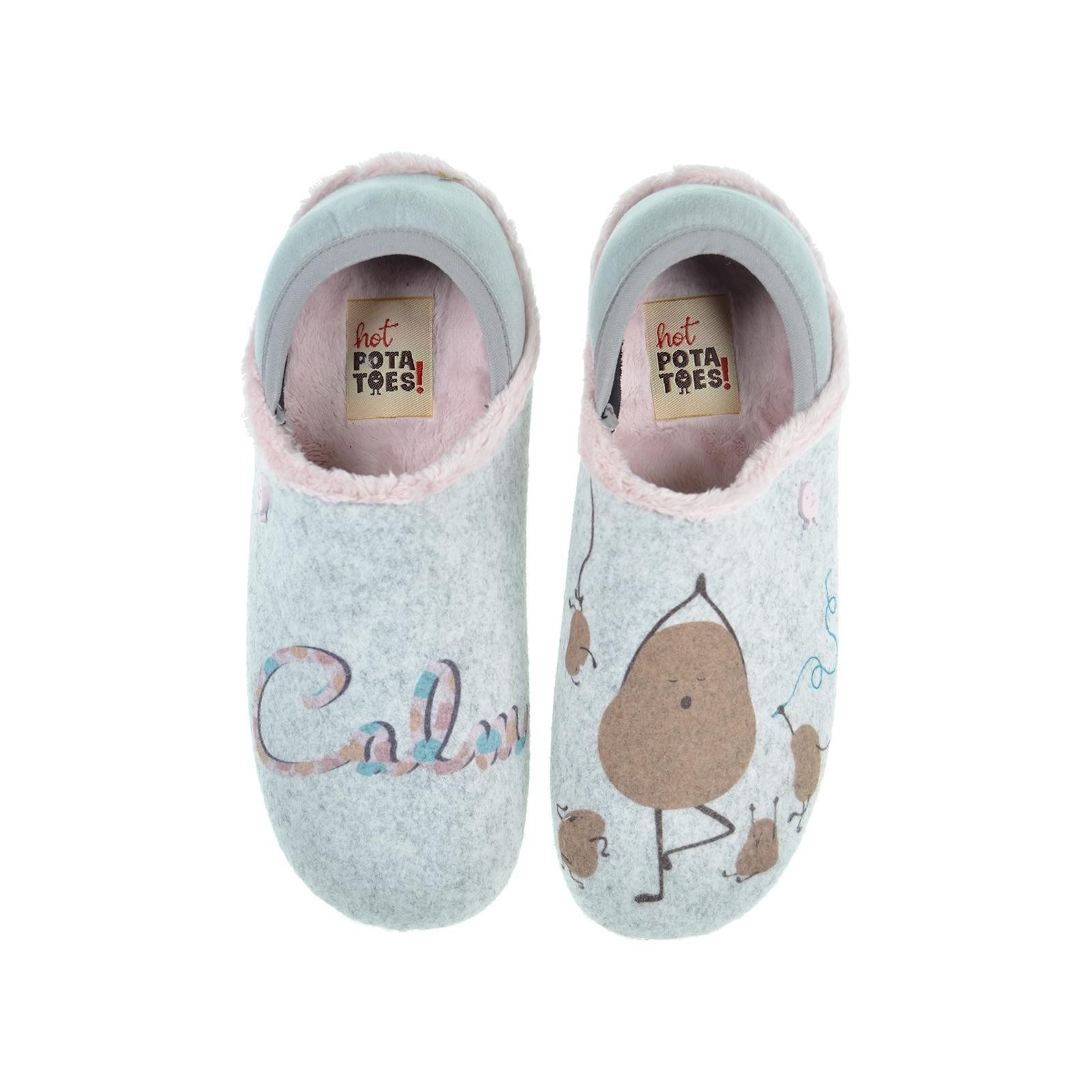 64637 Berwang Hot POTATOES!. Zapatilla de estar por casa con talón elástico para un ajuste perfecto, corte estampado de fieltro PET reciclado y planta afelpada de tejido poliéster suave. Plantilla extraíble de espuma poliuretano 100% reciclado y suela de caucho natural. Diseñadas para los pies más divertidos y atrevidos.