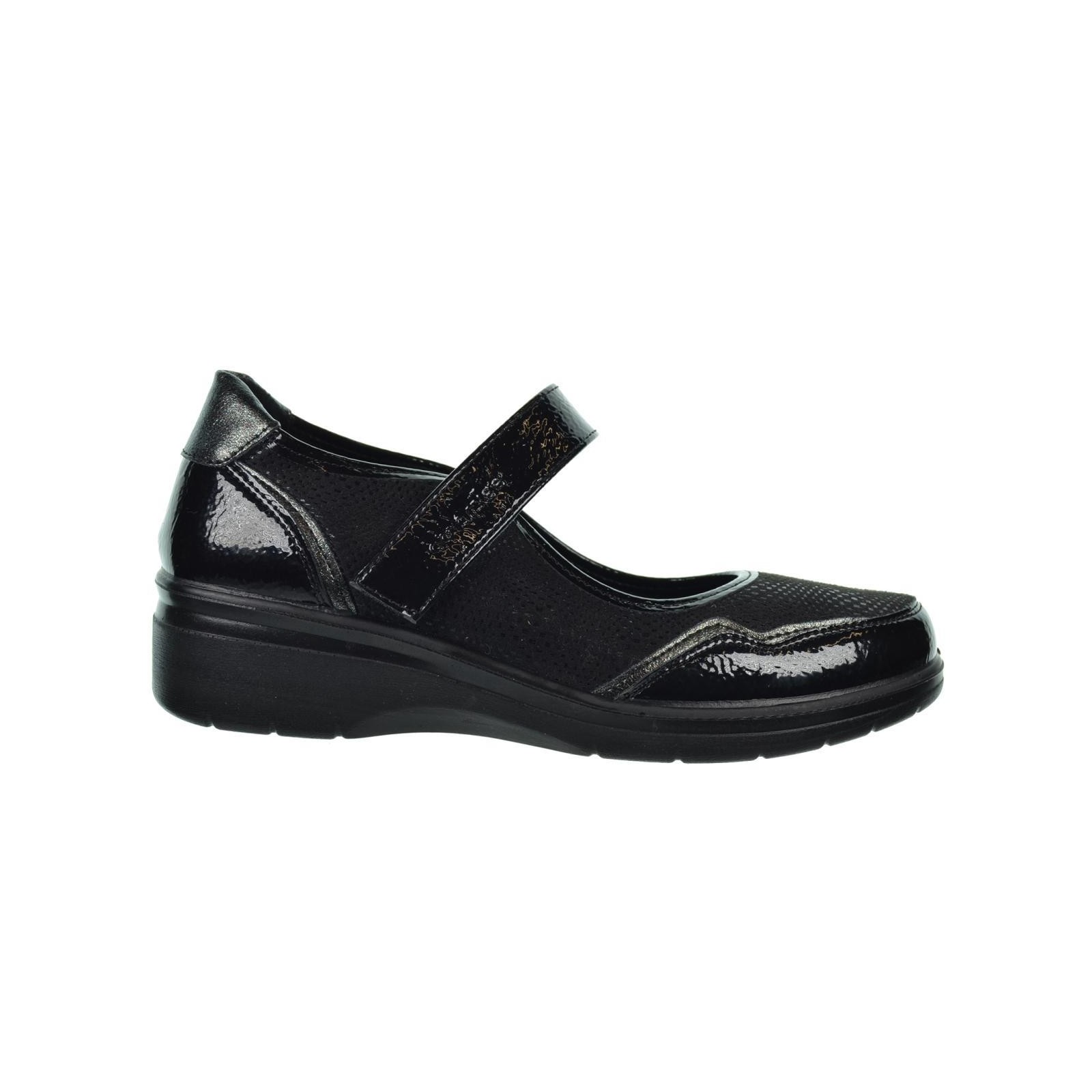 Amarpies 29381. Zapato en sintético charol con textil fantasia. Forrado interior y plantilla en textil acolchada confort extraíble. Cierre con velcro ajustable y suela de Poliuretano con cuña de 4cm de altura, muy ligera y flexible.Un diseño perfecto para tu día a día, con el que podrás caminar al máximo confort.