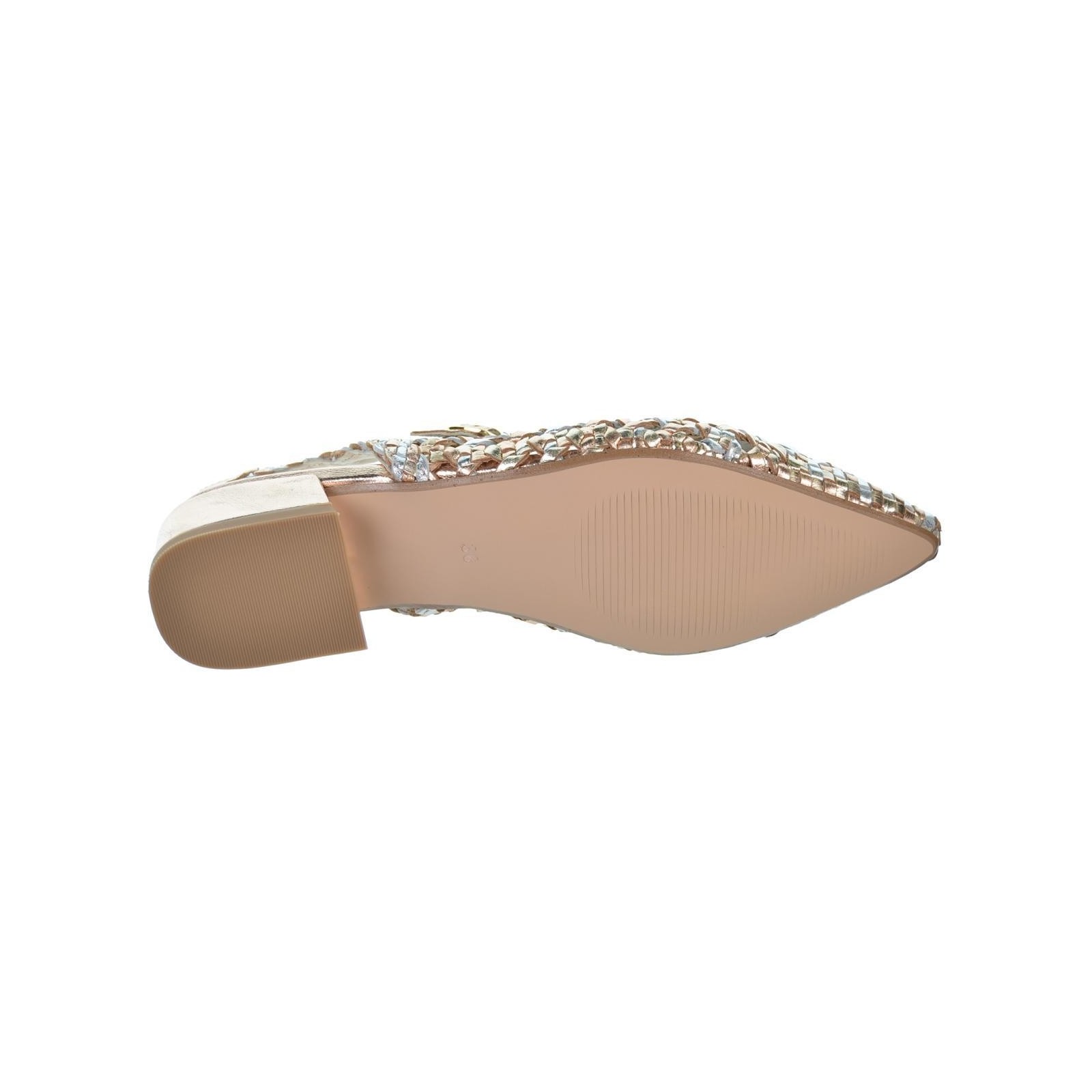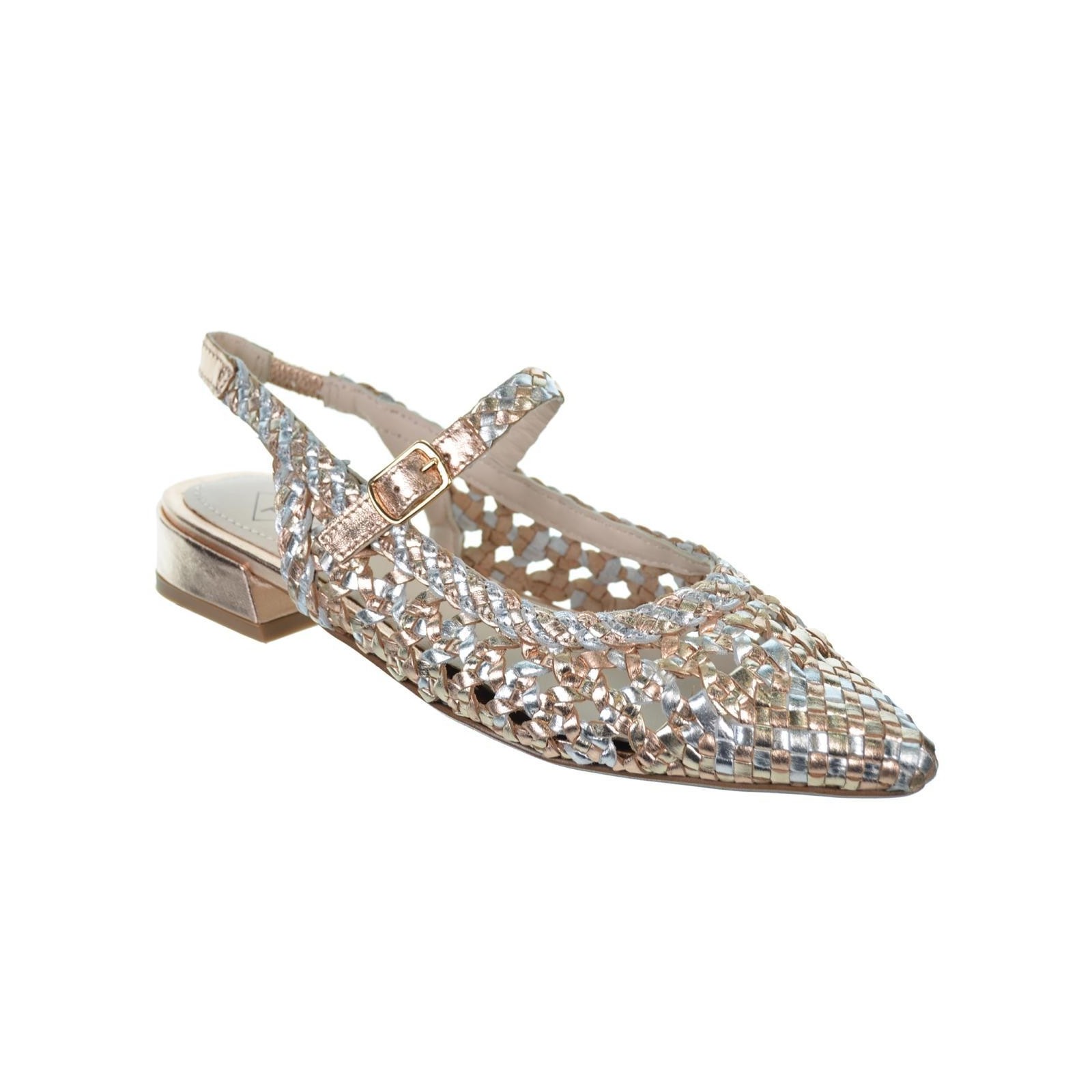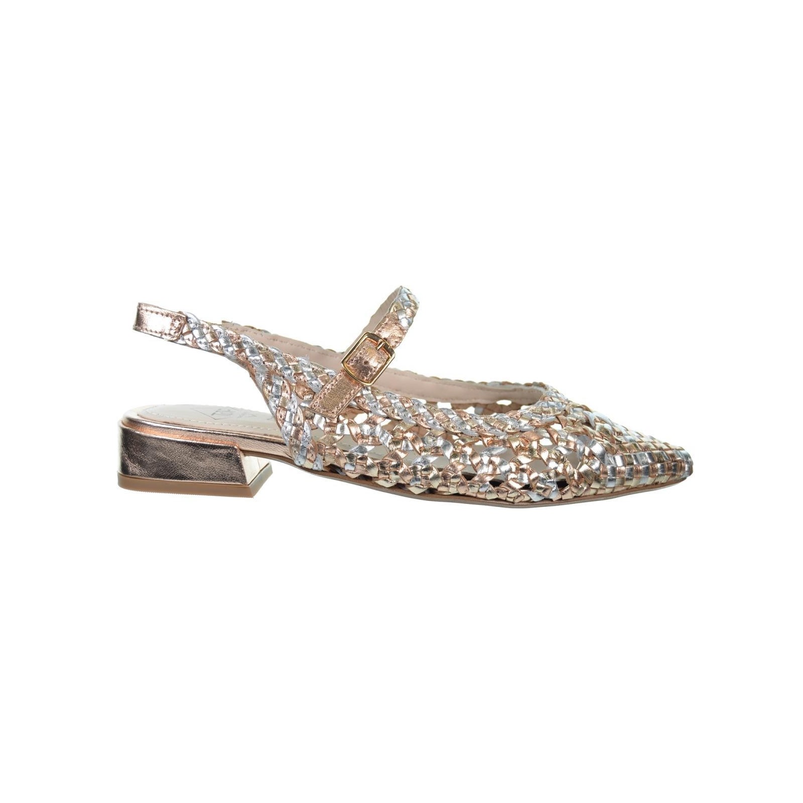 Top3 24466 Bailarinas de piel trenzada metalizada con punta fina. Cierre con hebilla regulable en empeine y elástico en talón. Plantilla acolchada muy confortable en piel. Tacón ancho de 2´5cm y suela de goma antideslizante muy flexible.Un diseño que no puede faltar en tu outfit.