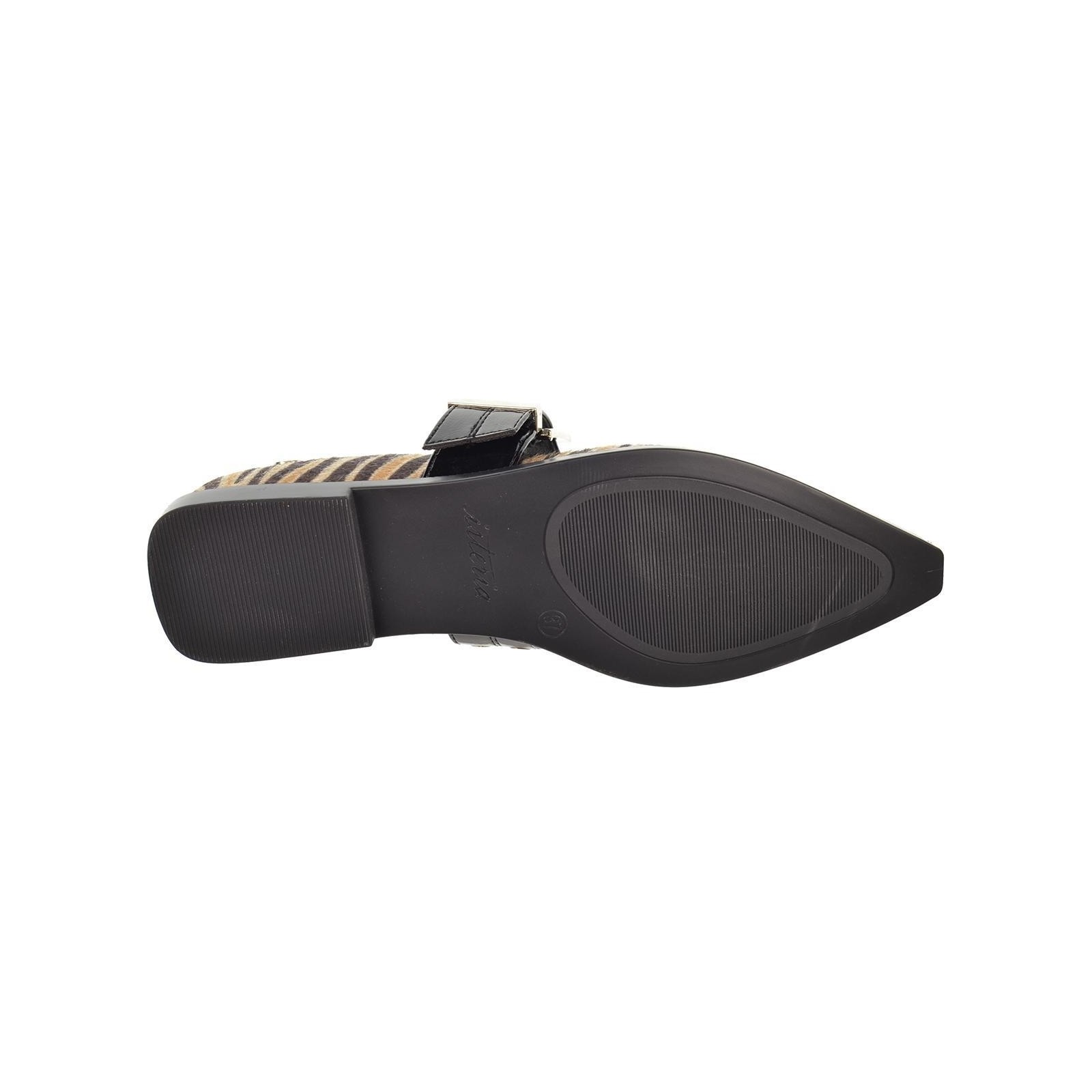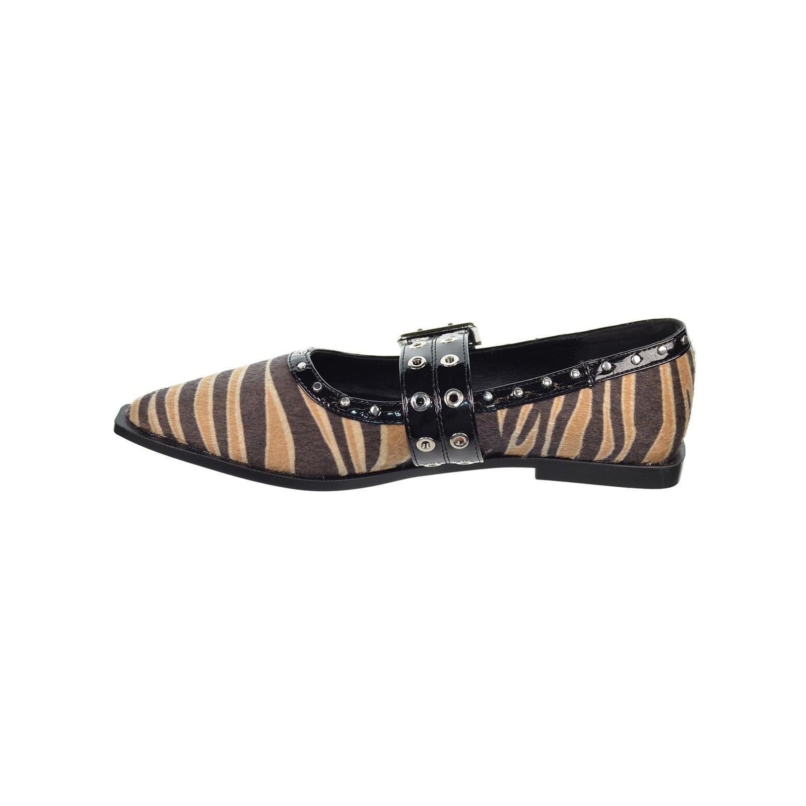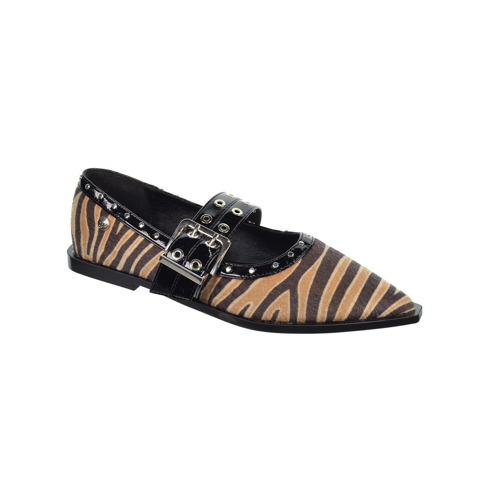 Isteria 532 Zapato en textil cebra con punta fina y decoración con remaches. Cierre con hebilla regulable en empeine. Forro y plantilla sintético acolchada muy confortable. Suela de caucho antideslizante muy flexible.Un diseño que no puede faltar en tu outfit.