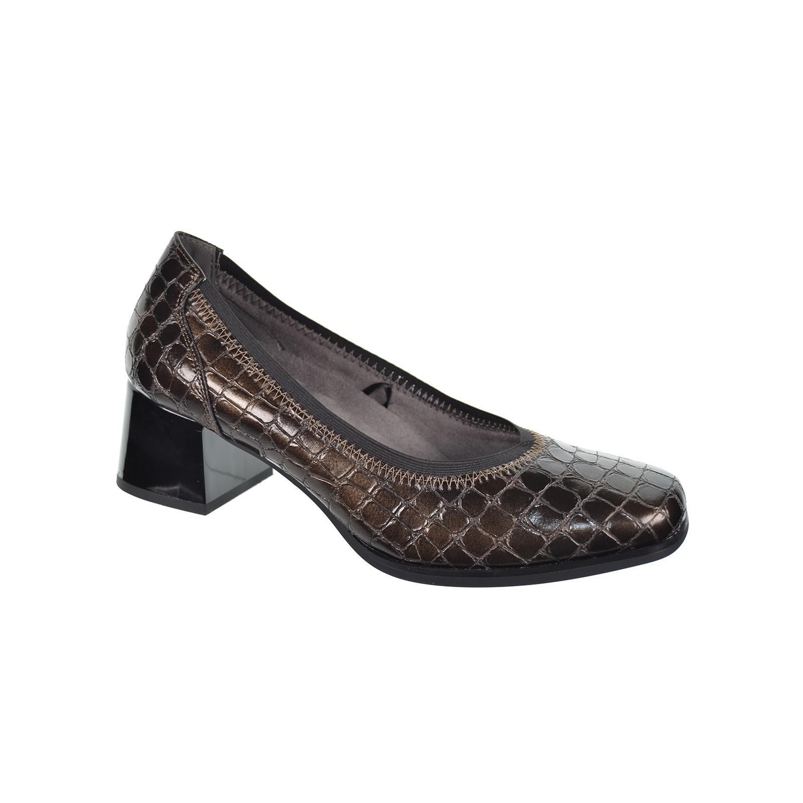 25381 Amarpies. Zapato estilo salón en charol sintético con elástico para una ajuste perfecto, forrado interior textil y plantilla acolchada confort extraíble. Suela de caucho con tacón ancho de 5cm. forrado en charol. Un diseño de moda para tu día a día, con el que podrás caminar al máximo confort.