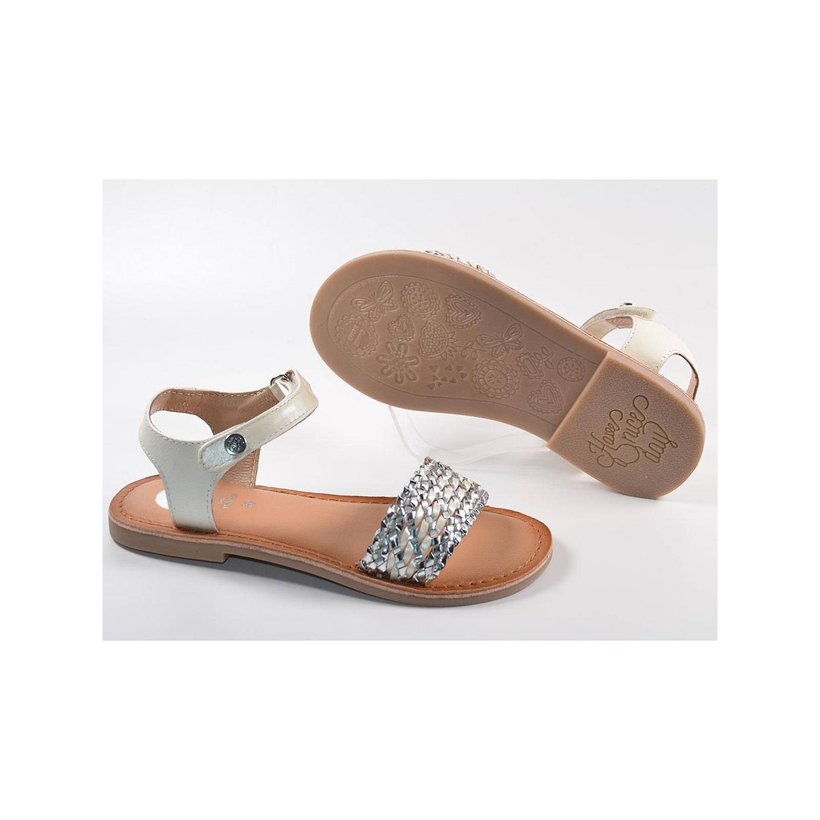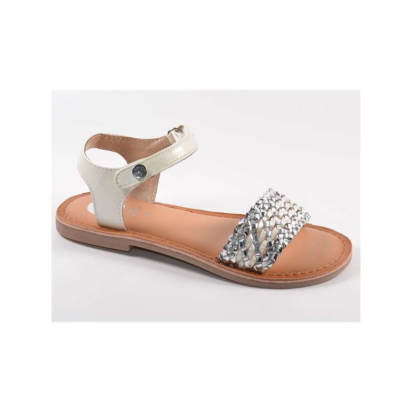 59477 Gioseppo. Sandalia material sintético. Pala trenzada metalizada. Pulsera con cierre velcro ajustable. Plantilla latex confortable. Piso plano de goma muy flexible. Para brillar con tus vestidos este verano.