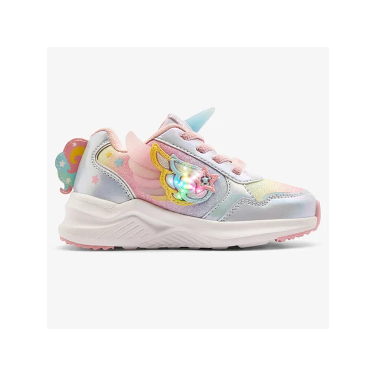 Conguitos 261027. Deportivo Unicornio en sintético con fantasía de colores. Iluminación en el lateral con cada pisada. Forro y plantilla extraíble textil acolchado. Cierre en cordones elásticos. Piso de eva termoconformada y suela de goma antideslizante, muy ligero y flexible.