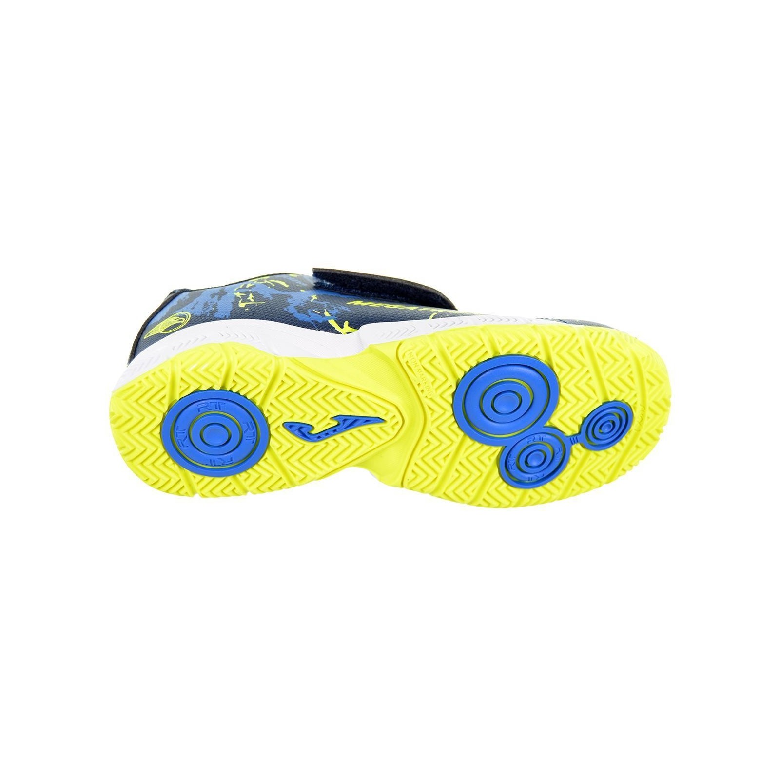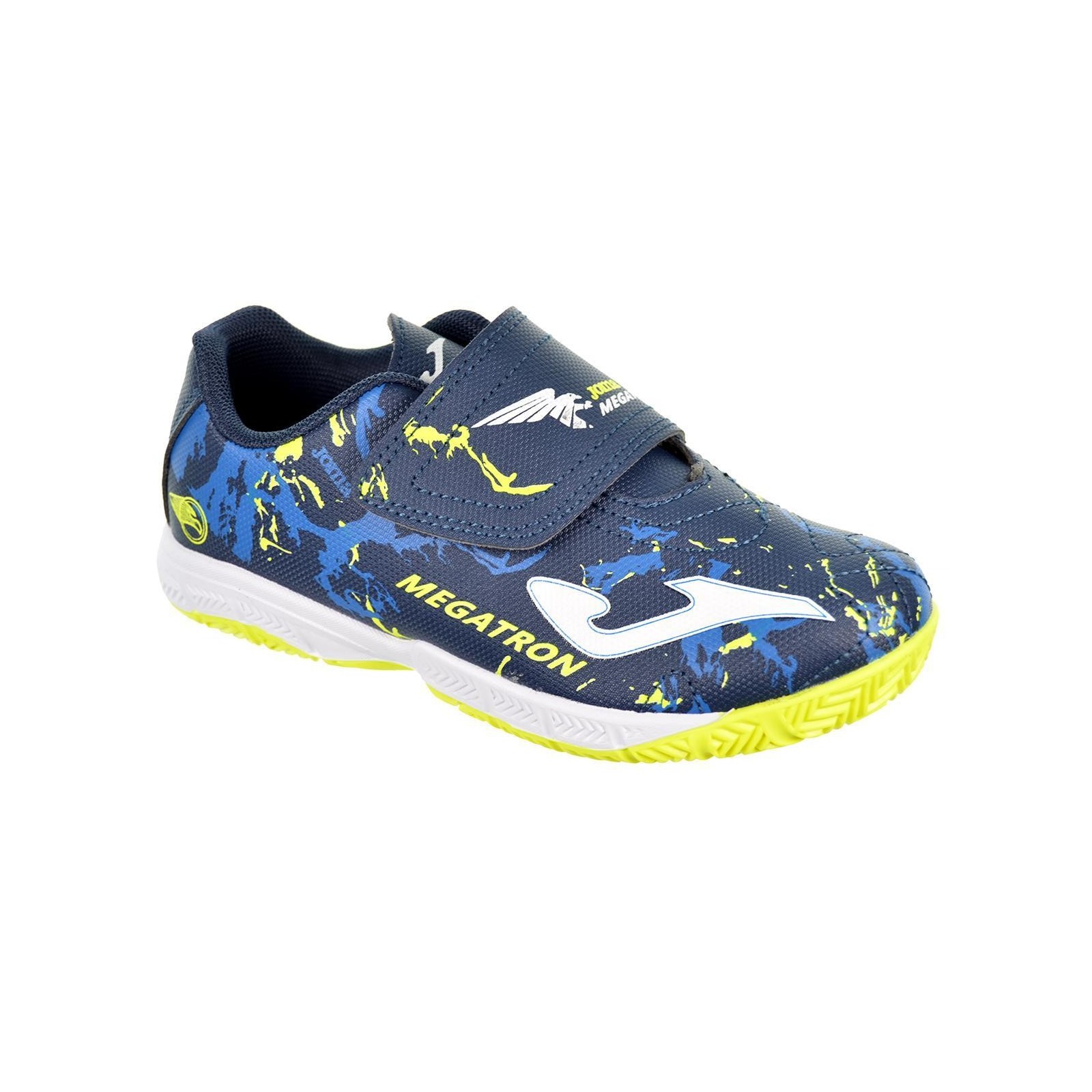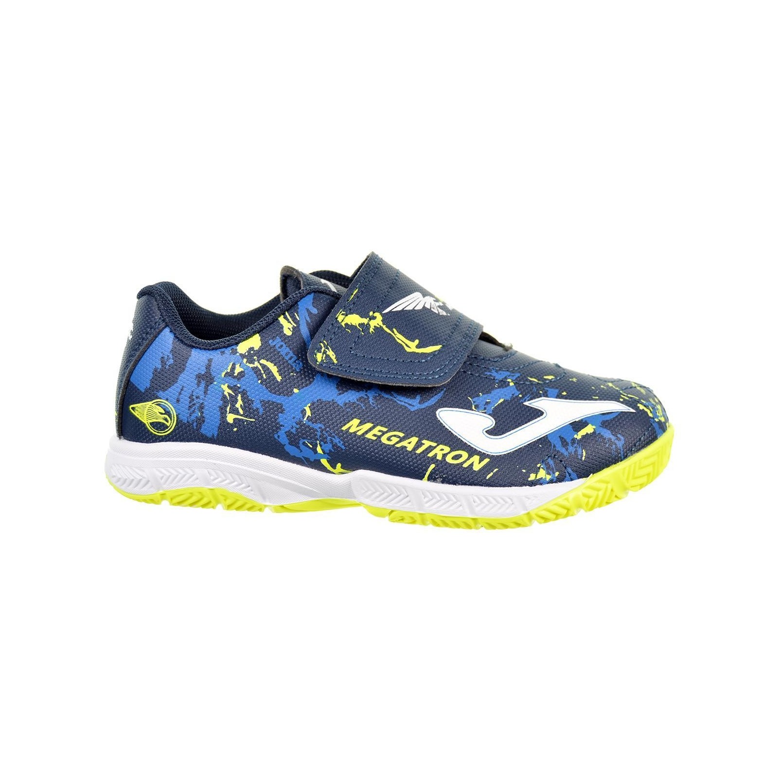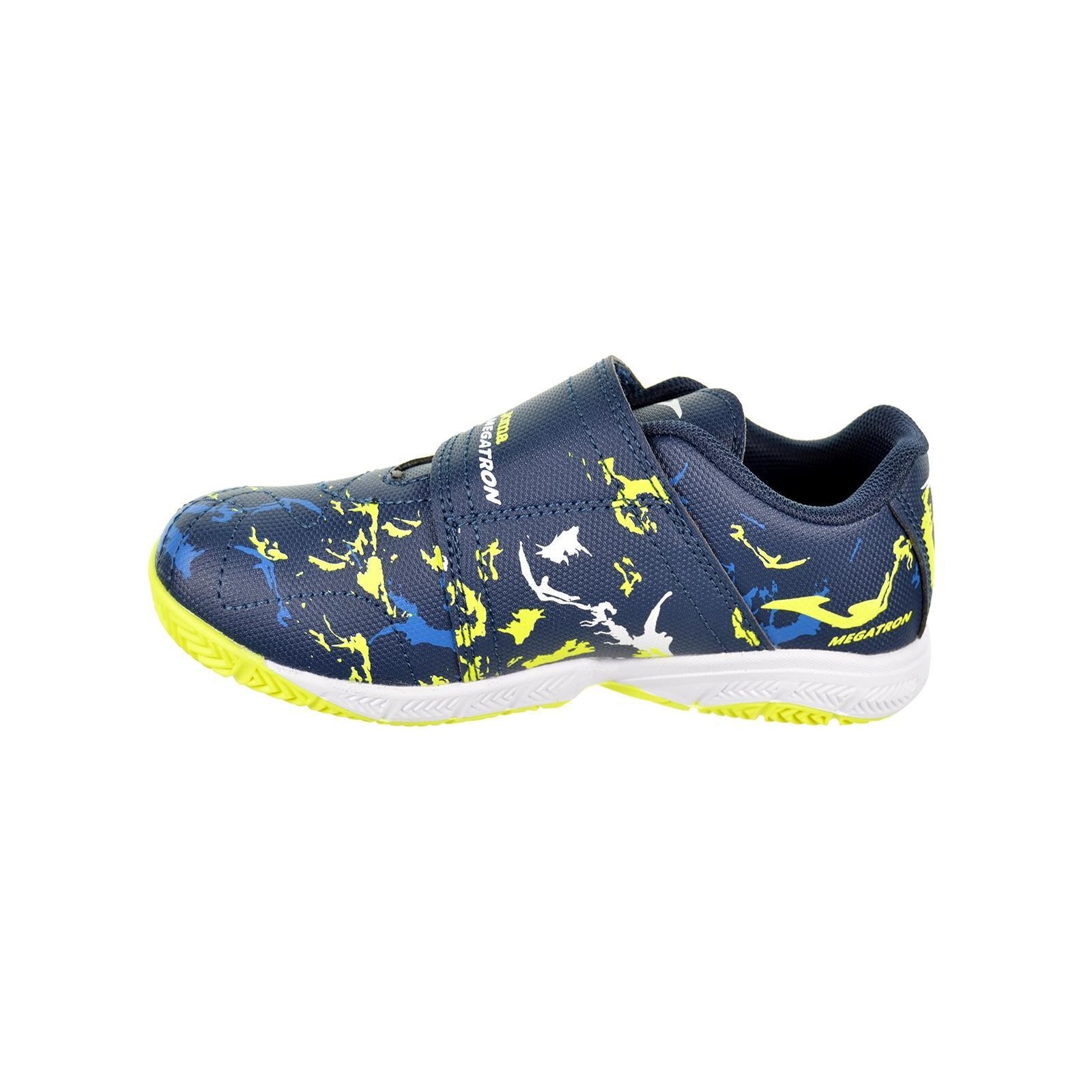 Joma Megatron 2403. Deportivo fútbol sala en material sintético de alta calidad. Forro interior y plantilla en nylon acolchado. Cierre con velcro ajustable. Piso de caucho antideslizante. Por su diseño, comodidad y durabilidad es un calzado de los más deseados por los peques.