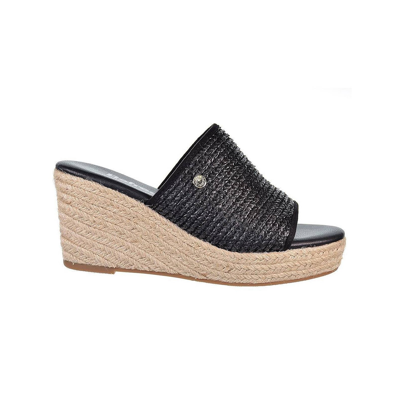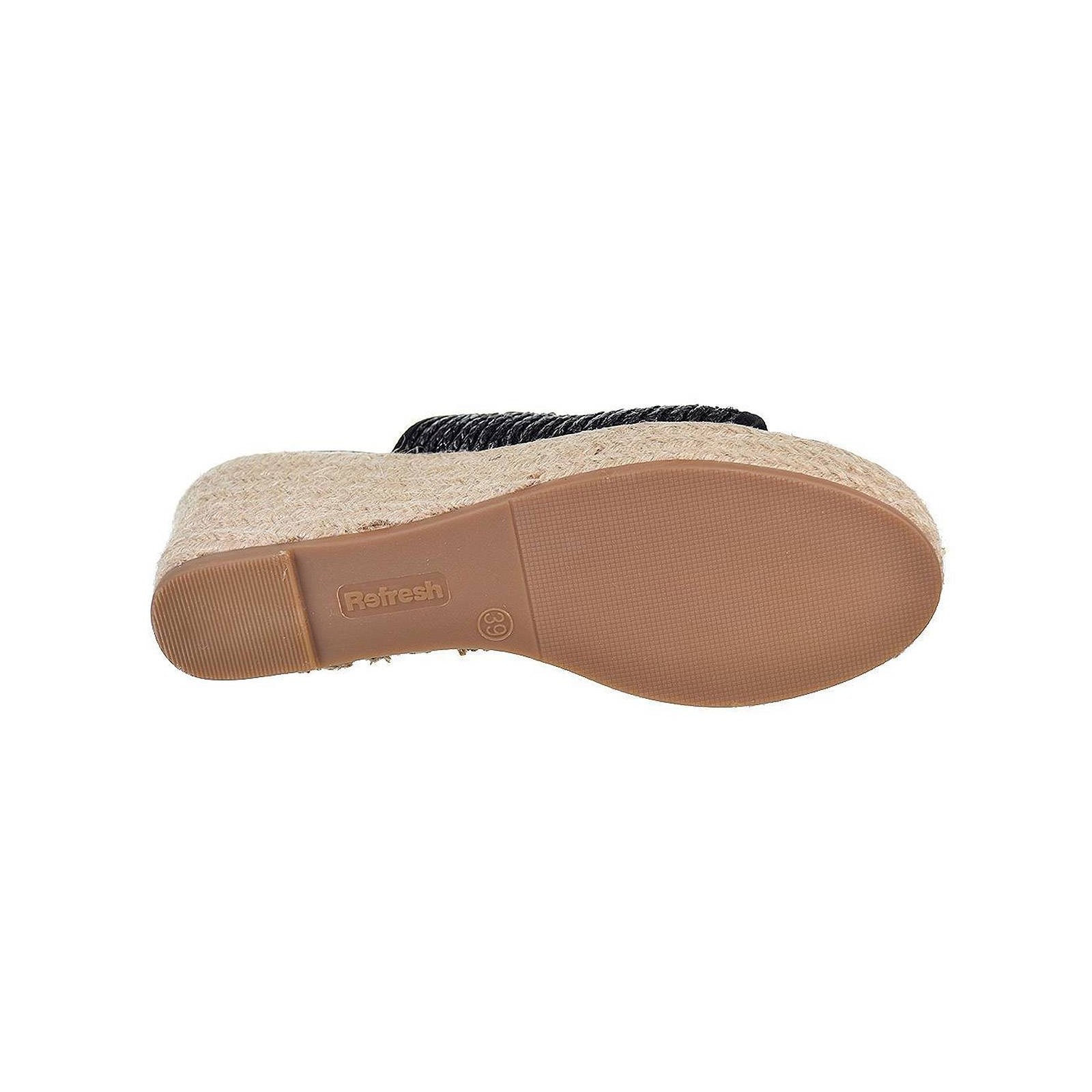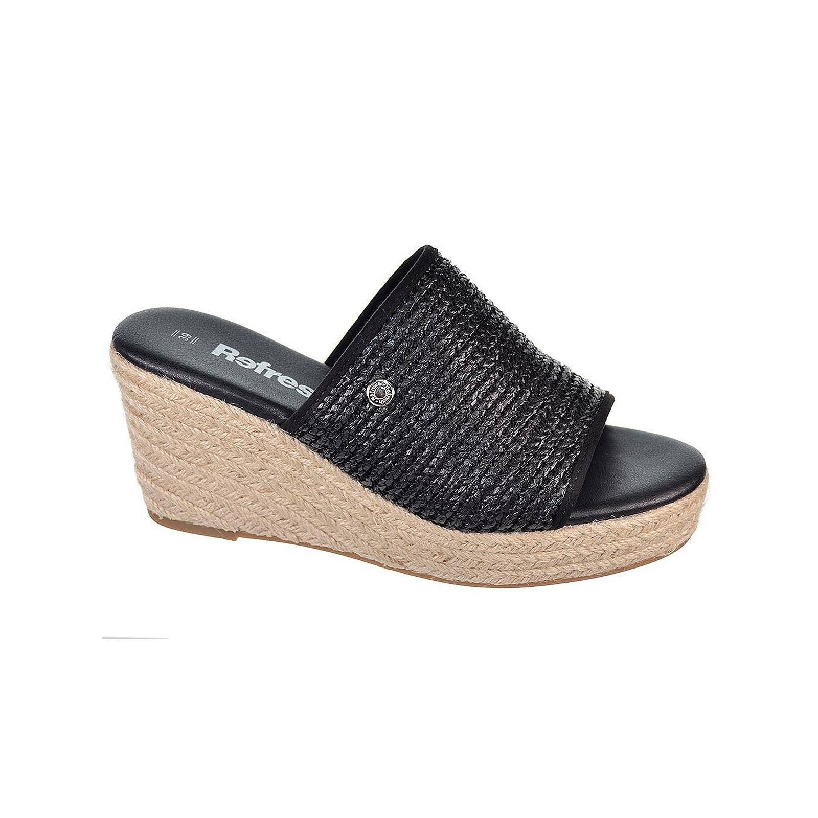 79808 REFRESH. Sandalia tipo Zueco en material de rafia, forrado interior en textil y plantilla acolchada muy confortable. Piso de plataforma con cuña de 8cm de altura, forrado en yute y piso de goma antideslizante. Ideal para combinar con tus vestidos y jeans de este verano.
