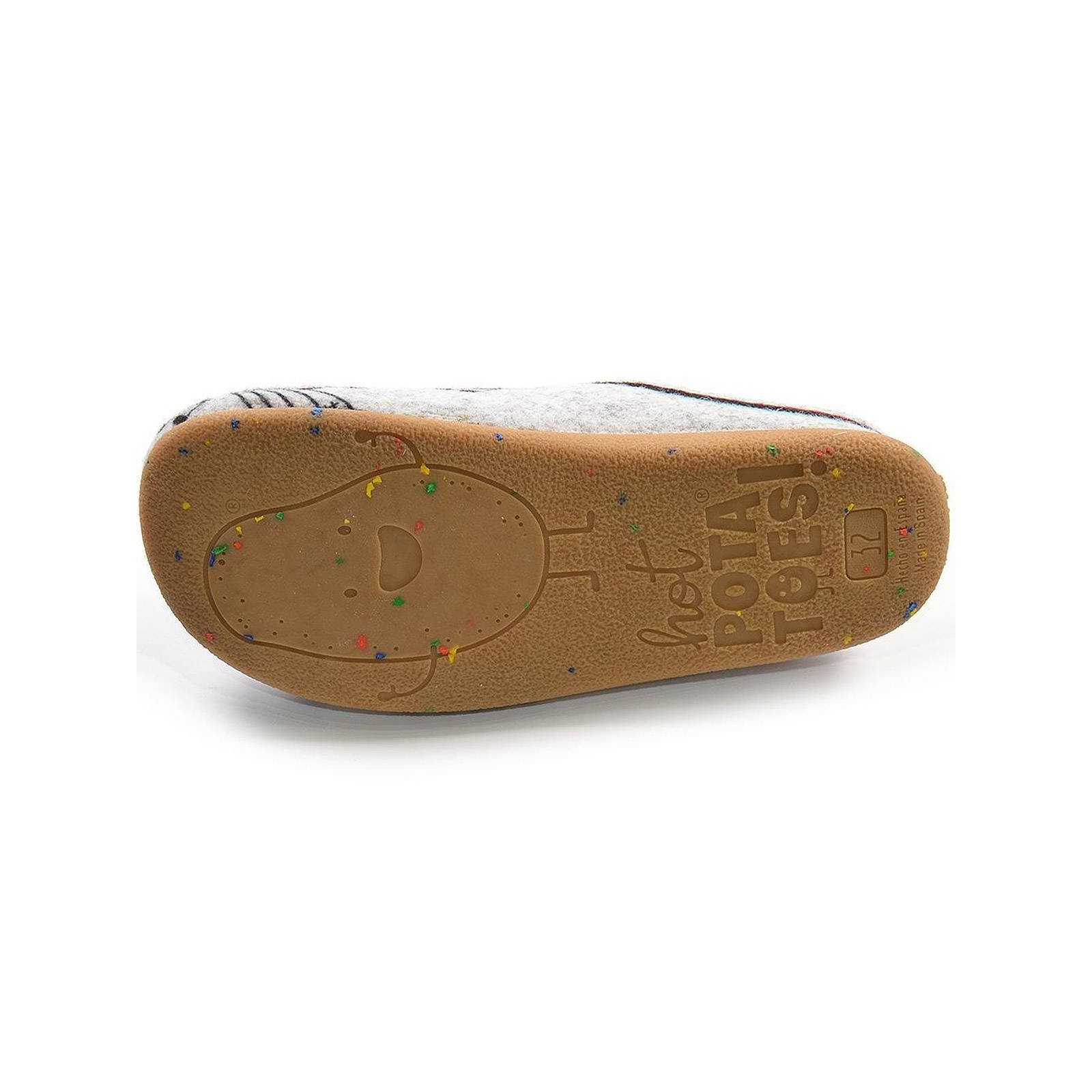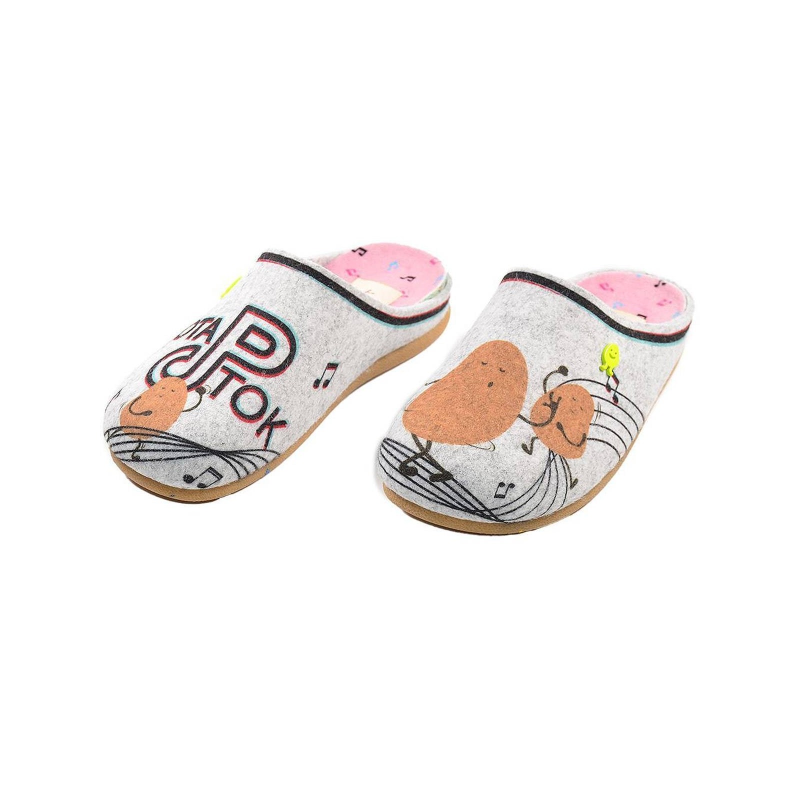 LINGENAR hot POTATOES!. Zapatillas de estar por casa tipo babucha, corte estampado de fieltro PET reciclado y planta afelpada de tejido poliéster suave. Plantilla extraible de espuma poliuretano 100% reciclado y suela de caucho natural. Diseñadas para los pies más divertidos y atrevidos.
