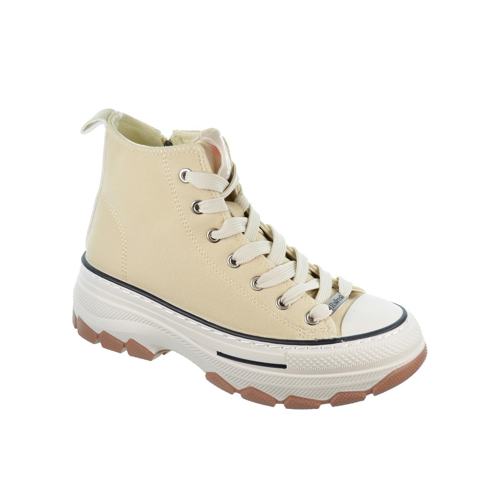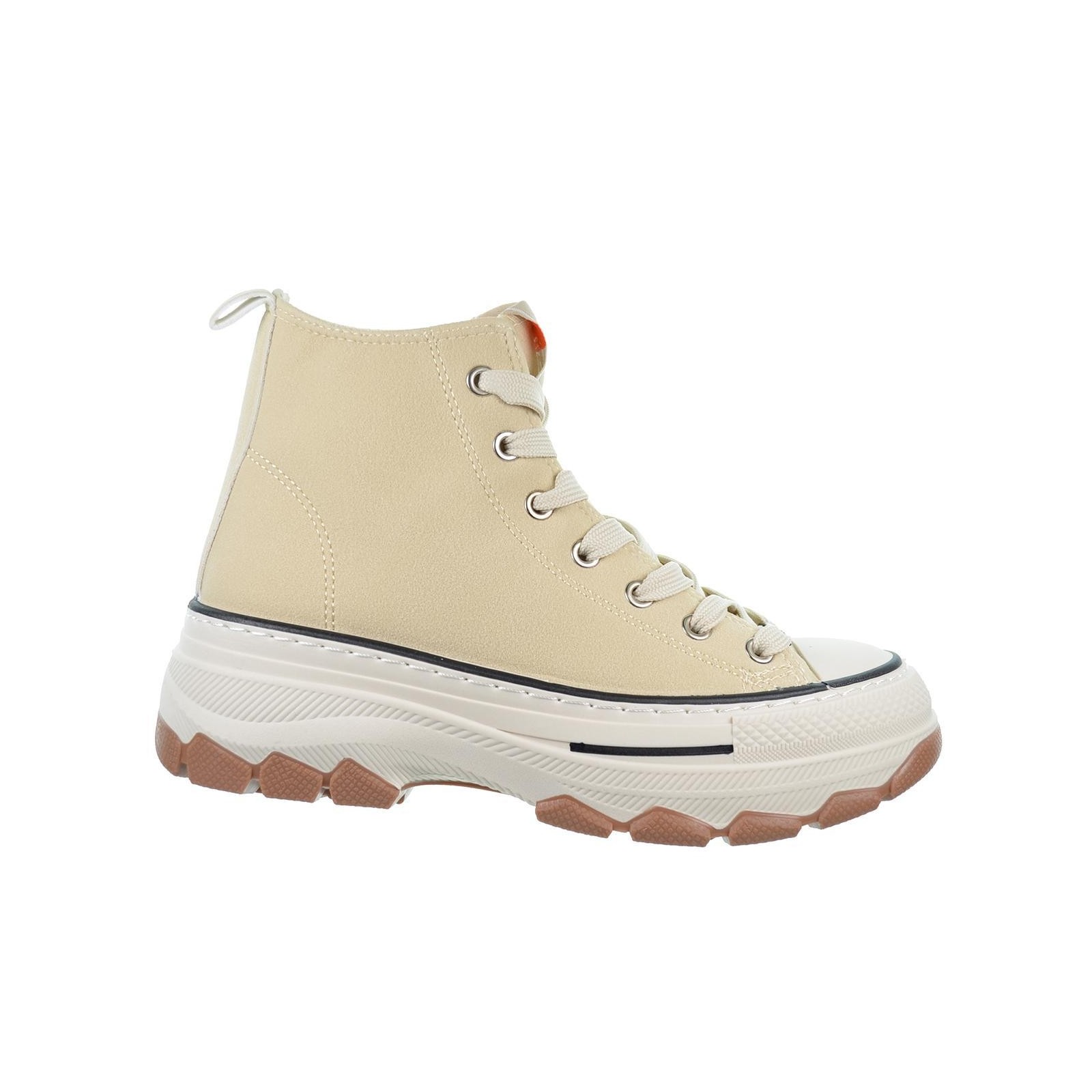 en material que imita la piel. Forro interior y plantilla extraíble en textil. Cierre mediante cremallera lateral interior y cordones para un ajuste perfecto. Tirador trasero para facilitar la puesta. Piso volumen con suela dentada de goma antideslizante. Este modelo ha obtenido el certificado vegano por la organización mundial PETA (Organización de los derechos de los animales).